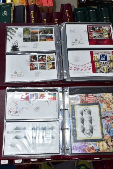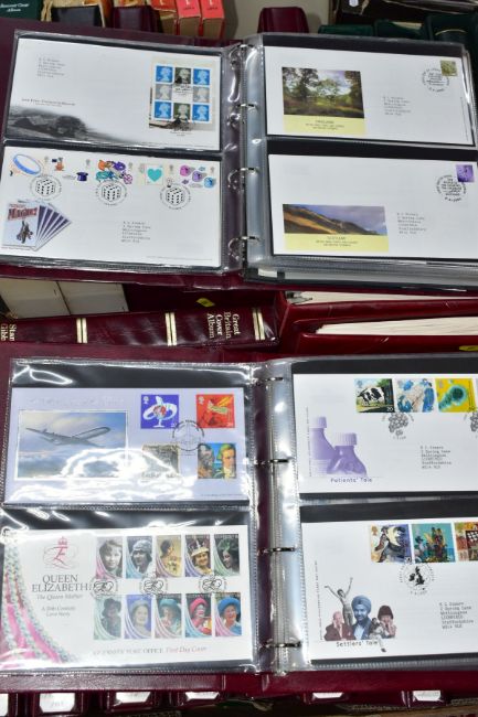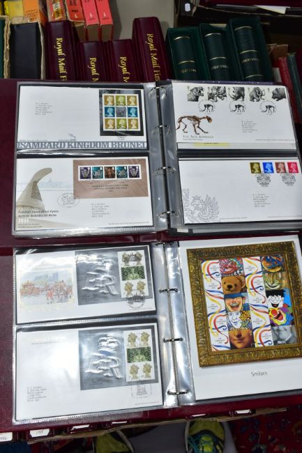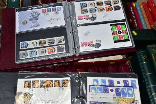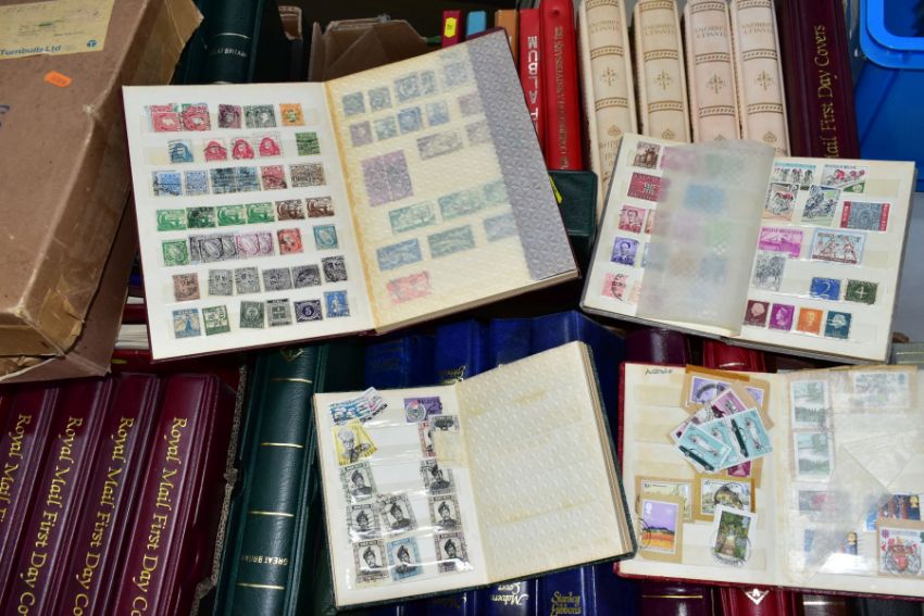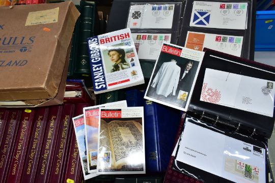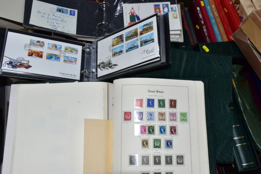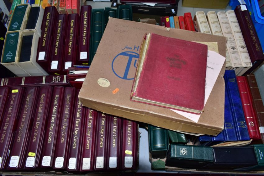 A LARGE MAINLY MINT GB COLLECTION in five boxes including mainly mint collection of GB in five Lighthouse albums, Sparse pre 1952 mint includes 1948 RSW, 1952 Tudor crowns, better graphites and early phosphors - good run of decimal face value to 2013 (not complete), also noted sixteen x R M cover albums with GB First Day covers from 1981 - 2013 including a few coin covers, also noted an album of GB prestige booklets and counter booklets, an interesting older collection of Worldwide in old ledger, a fine lot