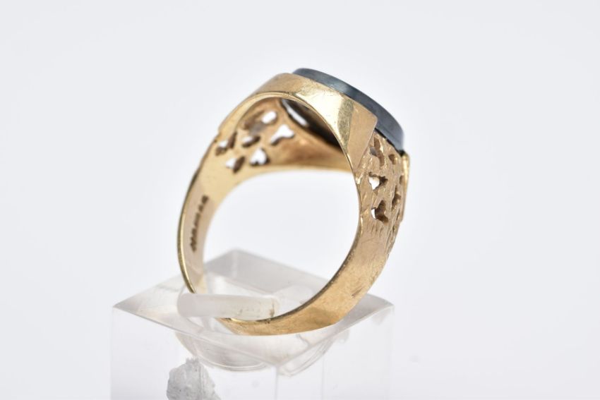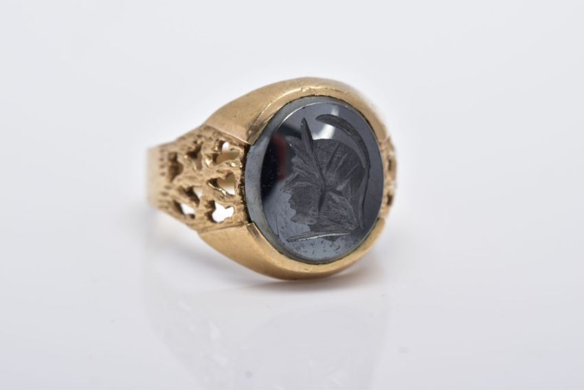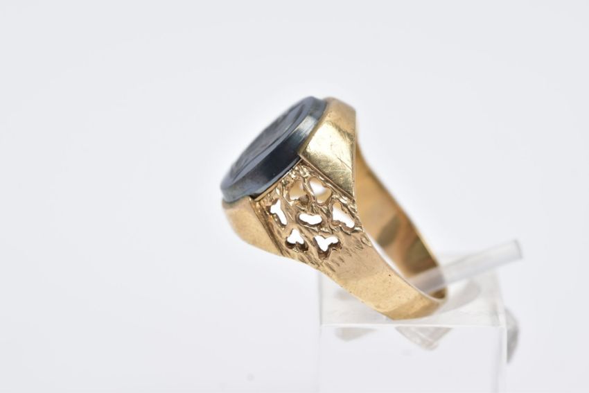 A GENTS 9CT GOLD HEMATITE SIGNET RING, designed with an oval hematite intaglio depicting a gentleman in profile wearing a helmet, textured openwork shoulders, hallmarked 9ct gold London, ring size O½, approximate gross weight 5.1 grams
