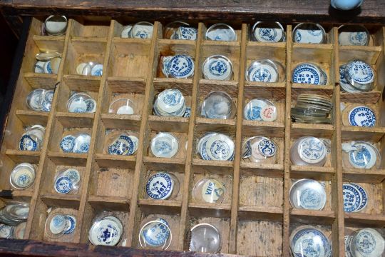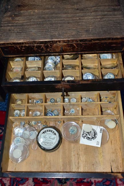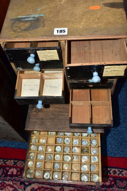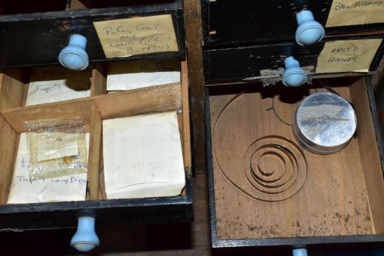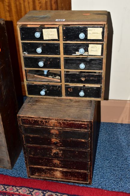 TWO SETS OF LATE 19TH CENTURY DRAWS, to include a bank of six long graduated draws, most draws with dividers, two draws with handles, three with screws, one without, measuring approximately height 330mm x width 273mm x depth 305m, contents to include a large quantity of organised watch glasses, along with a a hand built bank of ten draws, draw fronts painted black, fitted with blue handles (distressed condition), with contents to include an assortment of watch parts
