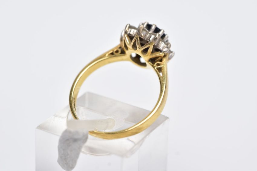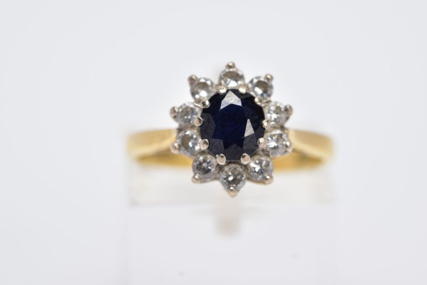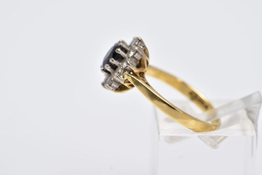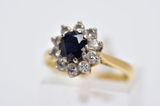 AN 18CT GOLD, SAPPHIRE AND DIAMOND CLUSTER RING, designed with a central oval cut blue sapphire, within a round brilliant cut diamond surround, total estimated weight 0.40cts, tapered shoulders, hallmarked 18ct gold London, ring size L, approximate gross weight 3.9 grams (condition report: overall condition good, general light wear, stones in good condition)