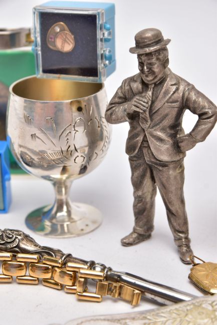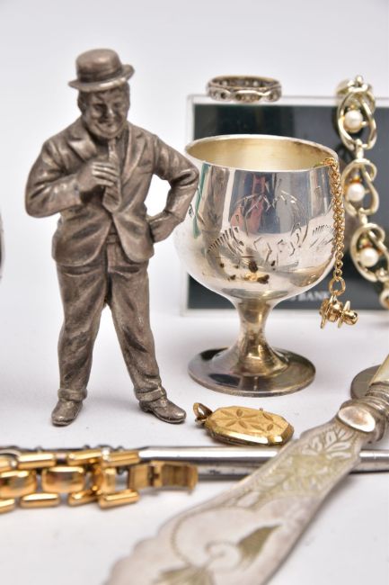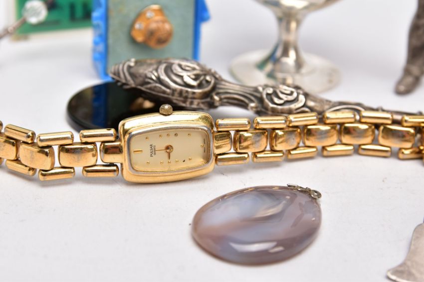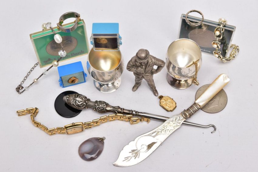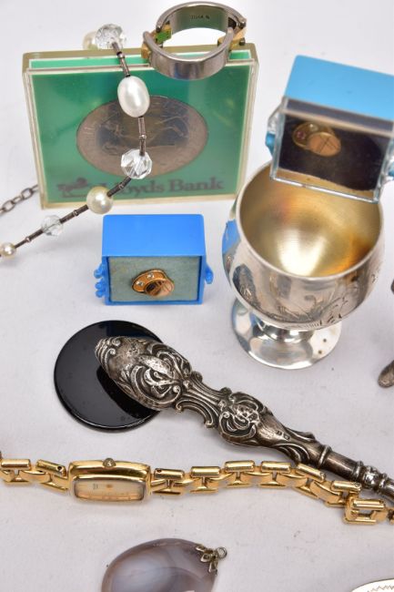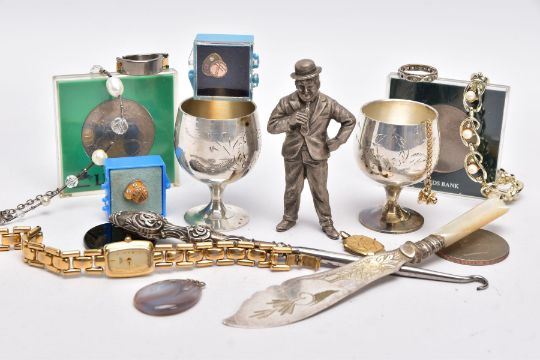 A BAG OF ASSORTED ITEMS, to include a titanium gents ring, with two moveable links, one set with a princess cut diamond, stamped diamond weight 0.10cts, stamped 750 AU, ring size V½, silver handled button hook, hallmarked Birmingham, fitted with a steel hook, a pair of EPNS goblets, each with an engraved wreath design, two 'Hoover' service pins set with diamonds and rubies, a white metal male figure, two cased commemorative coins, an agate pendant, a mother of pearl handled fish knife, a ladies 'Pulsar' wristwatch, etc