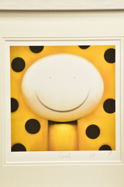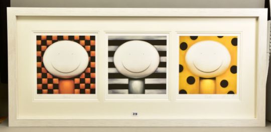 DOUG HYDE (BRITISH 1972) 'BRONZE, SILVER, GOLD', a limited edition print 133/395 depicting three smiling faces within a three aperture mount, signed bottom right, with certificate, each image approximately 33cm x 32cm, frame 59cm x 128cm (Condition Report:- good condition) (ARR)