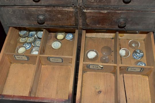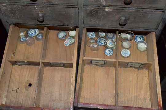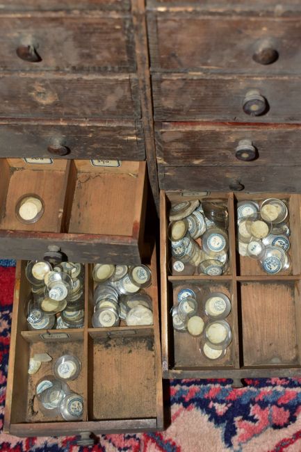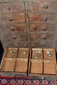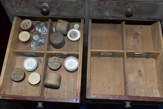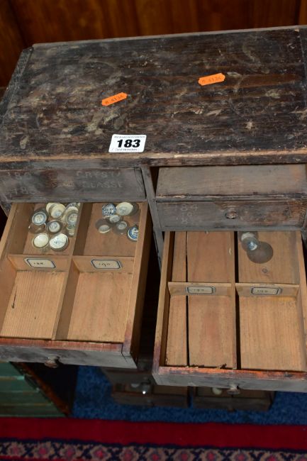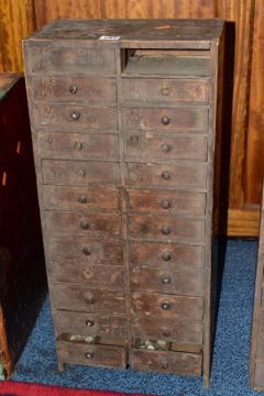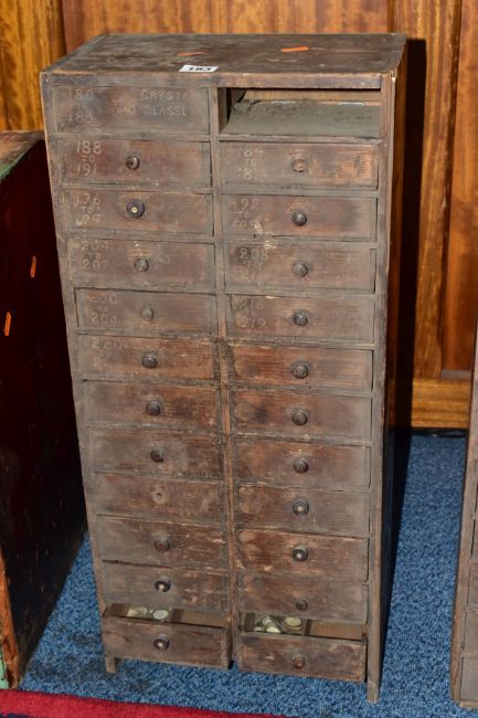 A LATE 19TH CENTURY PINE BANK OF TWENTY FOUR DRAWS, all draws with dividers, one draw missing, fitted with some wooden handles and five believed to be red bakelite (three handles missing), measuring approximately height 685mm x width 312mm x depth 188mm, together with contents including watch glasses (condition report: distressed, replacement back board, missing handles)
