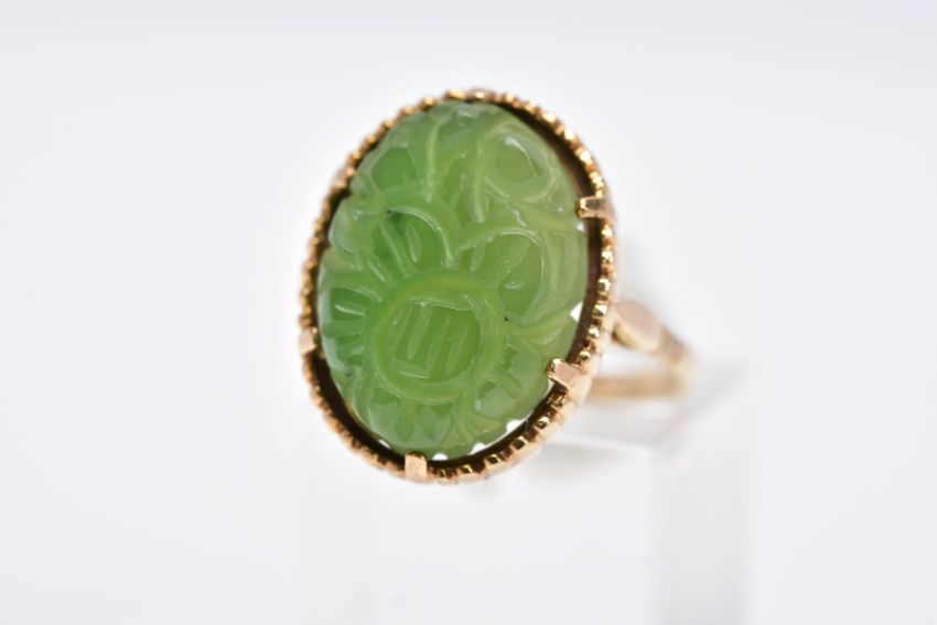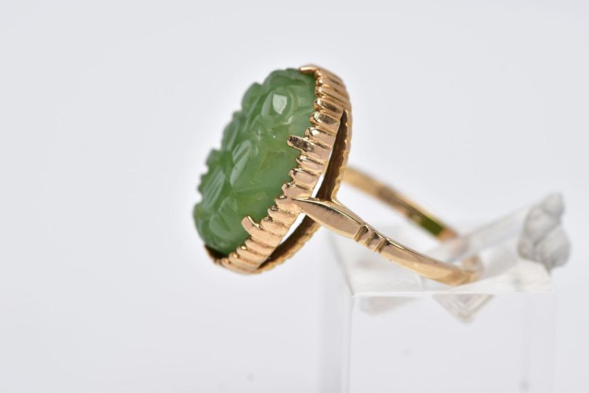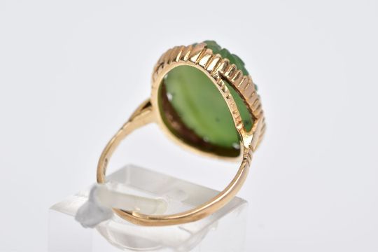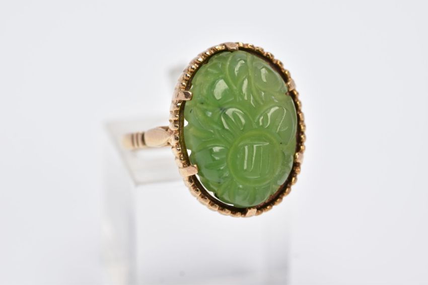 A 9CT GOLD, CARVED NEPHRITE CAMEO RING, of an oval form with a carved floral design, beaded surround, hallmarked 9ct gold London, ring size O, approximate gross weight 4.9 grams (condition report: overall condition good, general light wear)