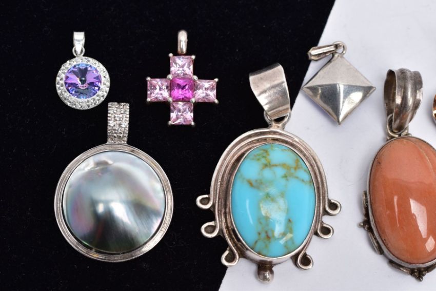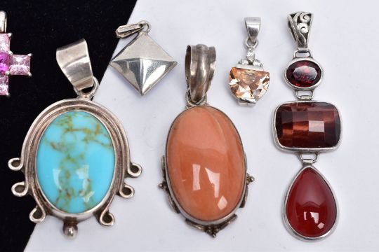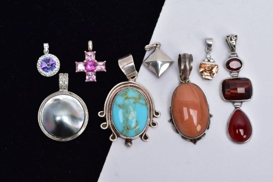 A BAG OF ASSORTED WITE METAL PENDANTS, eight pendants in total of various designs such as a turquoise cabochon set pendant within a collect mount and scroll detailed surround, tapered bail, stamped 'Mexico 925', an abalone shell set circular pendant set with a colourless stone set bail assessed as topaz, stamped '925', a multi drop pendant set with tigers' eye, garnet and chalcedony, stamped '925', along with other paste set pendants, etc