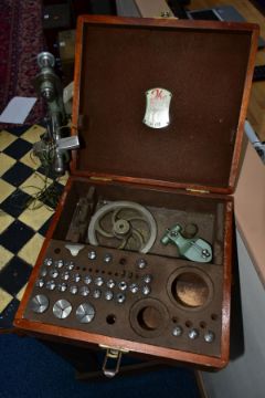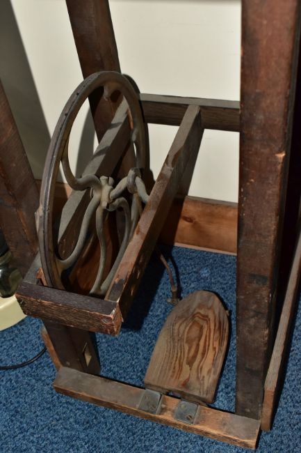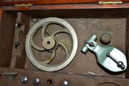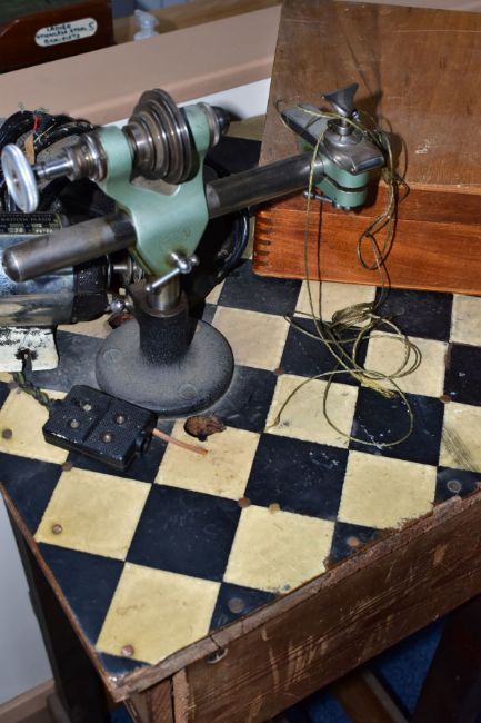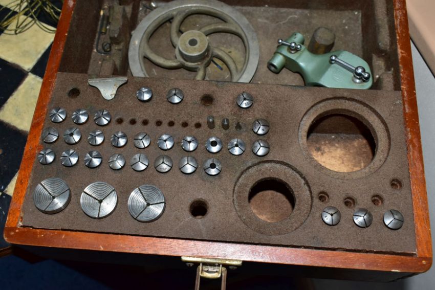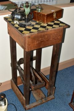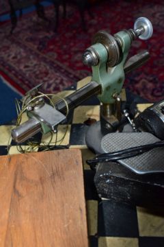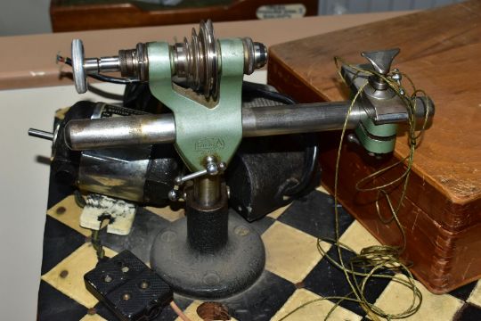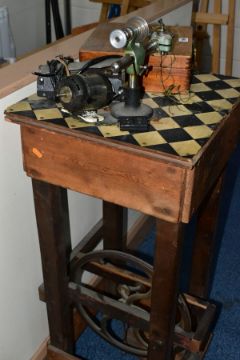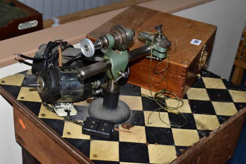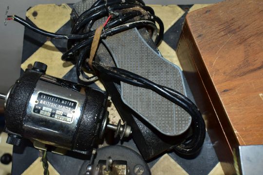 A WATCH MAKERS TREADLE LATHE, attached is a 'Pultra Manchester' watch makers lathe with additional tools and its original fitted box, also with a universal motor and peddle attachment (untested, some parts missing)