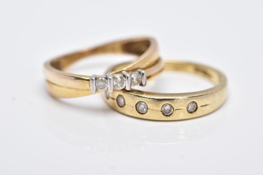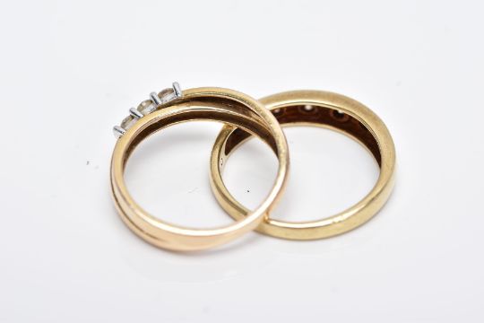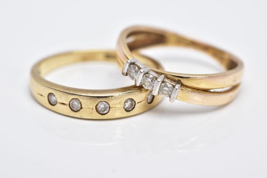 TWO 9CT GOLD DIAMOND RINGS, the first of a crossover design, set with three round brilliant cut diamonds, total estimated diamond weight 0.15cts, plain polished band, hallmarked 9ct gold Sheffield, ring size L, together with a band set with five rub over set round brilliant cut diamonds, stamped diamond weight 0.15cts, plain polished band, hallmarked 9ct gold Sheffield, ring size N ½, approximate gross weight 4.4 grams