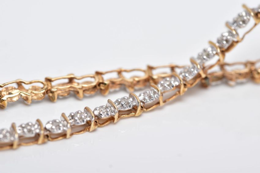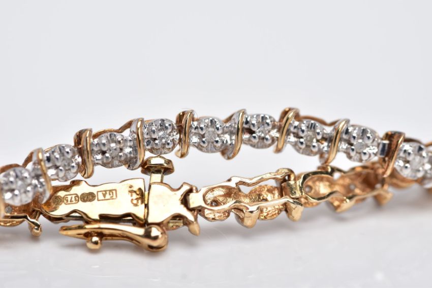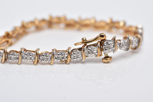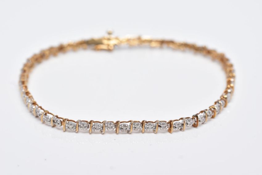 A 9CT DIAMOND LINE BRACELET, designed with a row of individual claw set, single cut diamonds, stamped diamond weight 0.25cts, interspaced with gold slightly curved gold bars, fitted with an integrated box clasp, hallmarked 9ct gold Sheffield, with an additional figure of eight safety clasp, length 200mm, approximate gross weight 5.0 grams (Condition Report:- Overall condition good, general light wear, clasp in working condition)