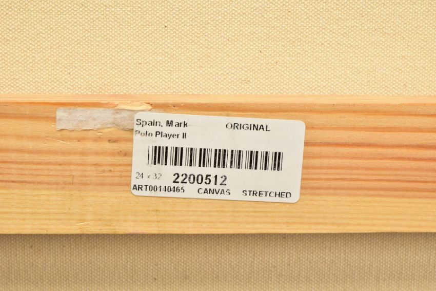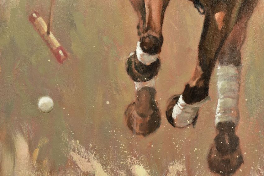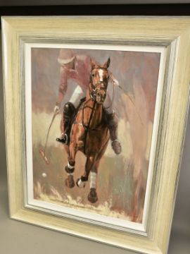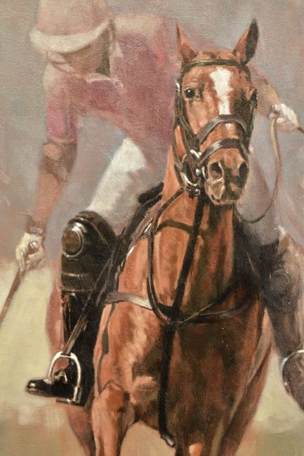 MARK SPAIN (BRITISH CONTEMPORARY), 'POLO PLAYER II' a portrait of a polo pony with rider about to strike the ball, signed bottom right, oil on canvas, approximate size - image 74cm x 59cm, frame 106cm x 86cm (Condition Report:- painting and frame in good condition) (ARR)