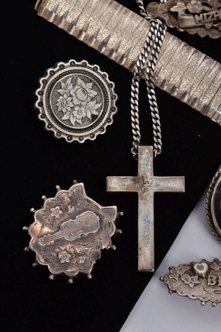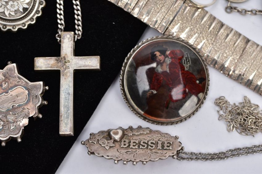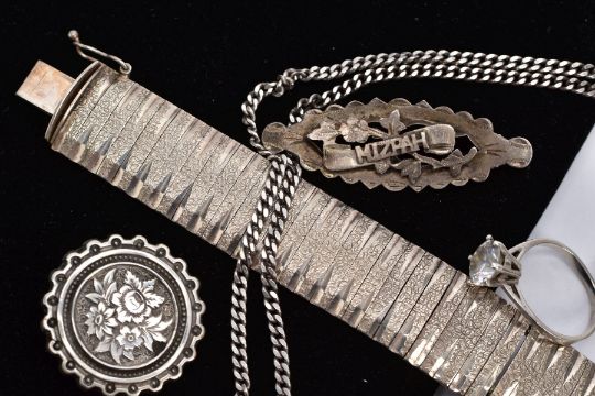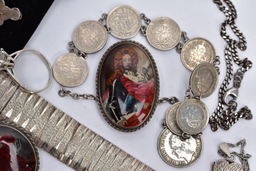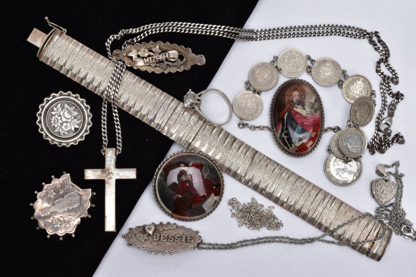 A SELECTION OF SILVER AND WHITE METAL ITEMS, to include a textured silver articulated bracelet, hallmarked Sheffield, a silver cross pendant hallmarked Birmingham, suspending from a curb link chain with lobster claw clasp stamped '925', four sweetheart brooches, three with hallmarks for Birmingham and Chester the other stamped 'Silver', a ten cents coin bracelet suspending a twenty five cent coin, a white metal single stone ring set with a cubic zirconia, stamped '925', with two other necklaces, etc