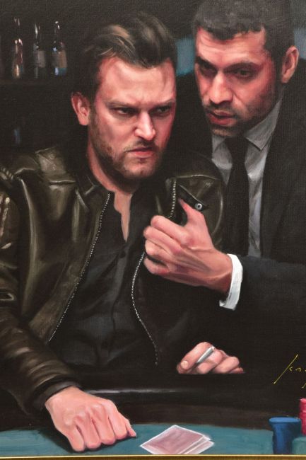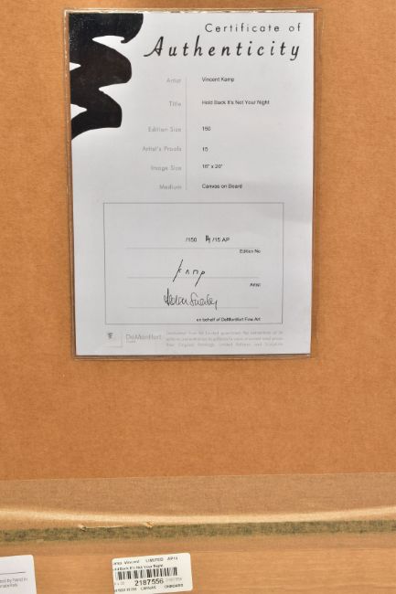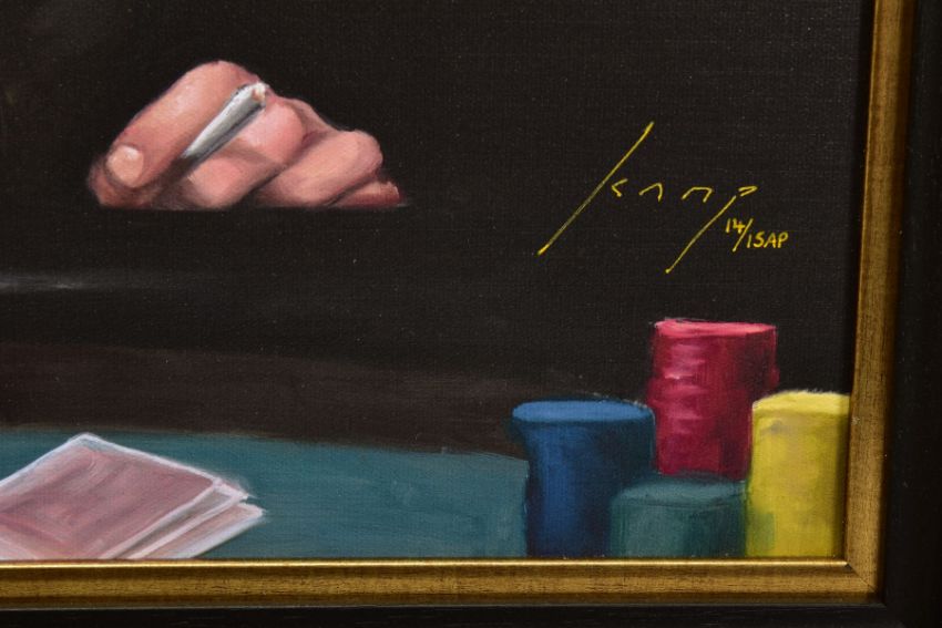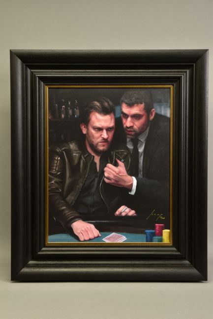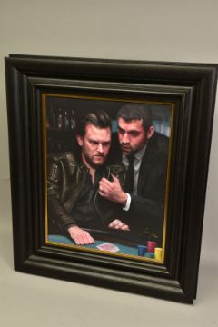 VINCENT KAMP (BRITISH CONTEMPORARY) 'HOLD BACK IT'S NOT YOUR NIGHT', an artist proof print depicting male figures gambling 14/15, signed bottom right, with certificate, approximate sizes: image 50cm x 39cm, frame: 73cm x 63cm (condition: small dent to lower left side of frame) (ARR)