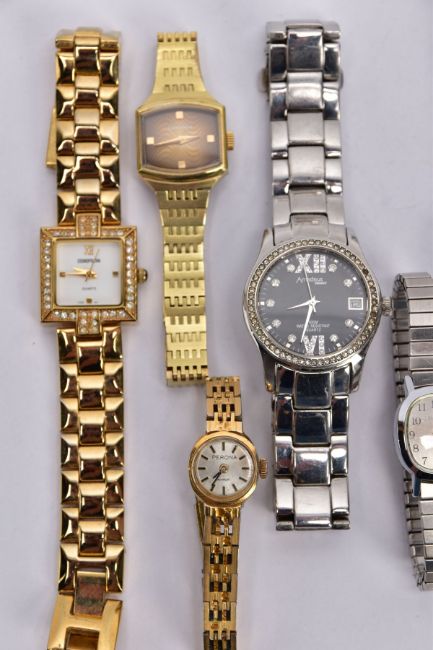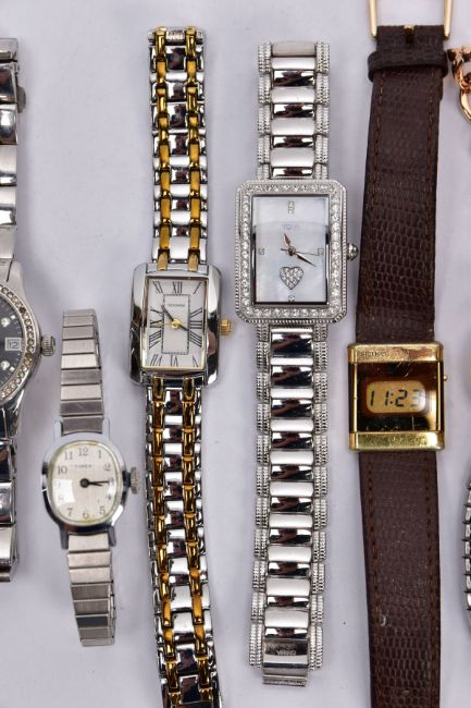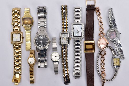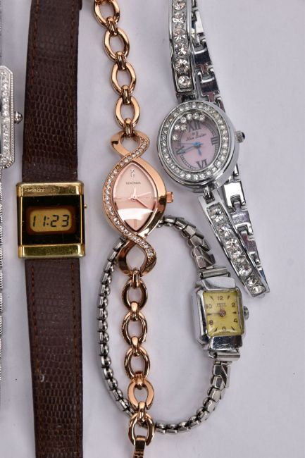 A BAG OF ASSORTED LADIES WRISTWATCHES, eleven watches in total, of various designs, to include a digital 'Seiko' brown square dial, fitted with a brown strap, a 'Longines' with a rounded square dial signed 'Longines' baton markers, gold tone hands, fitted with a gold tone bracelet and fold over clasp, with others such as 'Sekonda, Perona, Lanco' etc