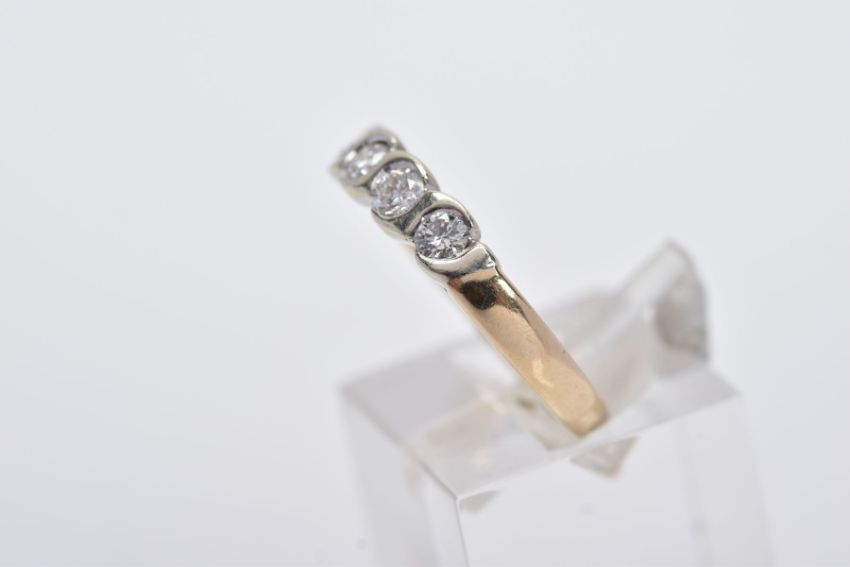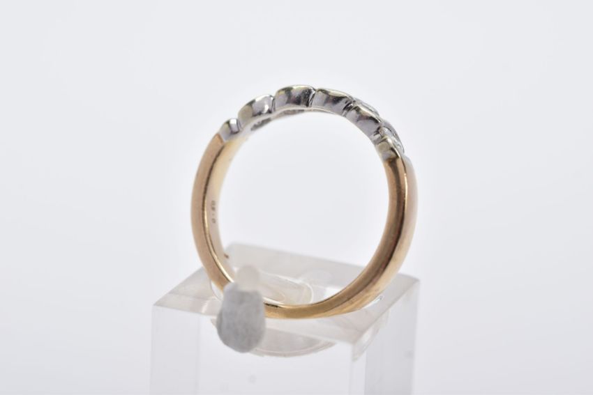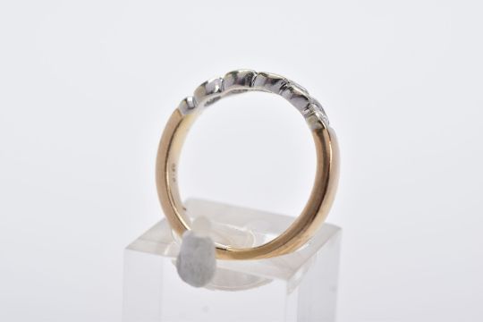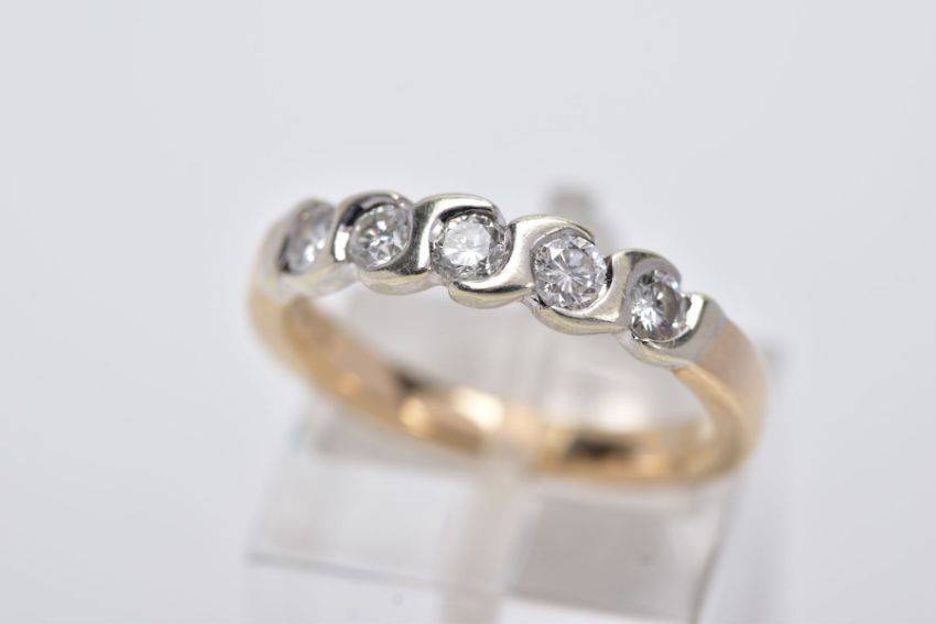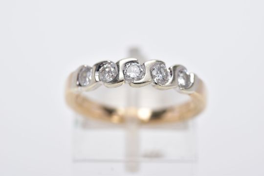 A 9CT GOLD FIVE STONE DIAMOND RING, designed with a row of round brilliant cut diamonds, each within a cross over setting, stamped diamond weight 0.50cts, hallmarked 9ct gold Sheffield, ring size K, approximate gross weight 3.5 grams (condition report: overall condition good, some general light wear, nice bright diamonds)