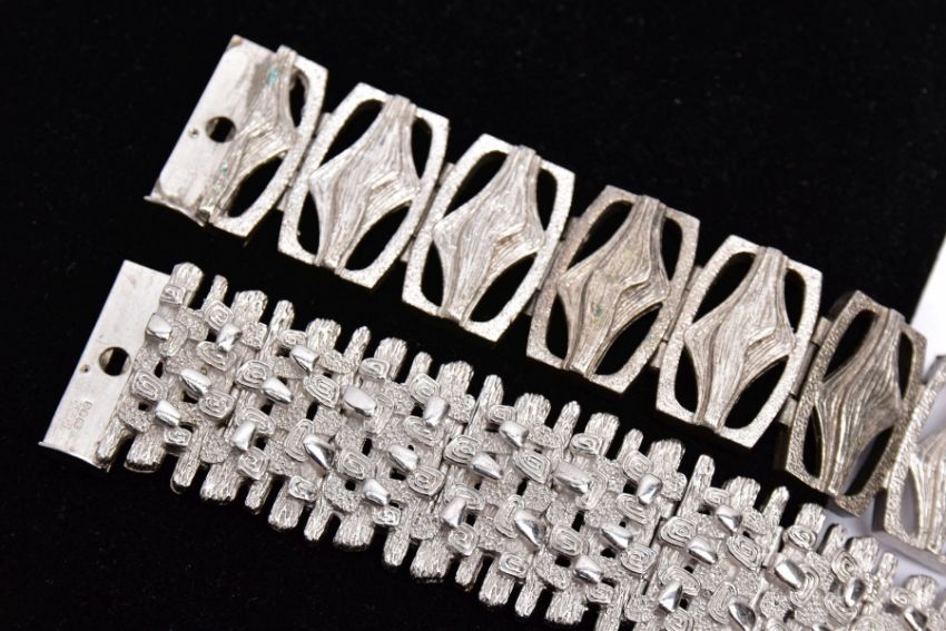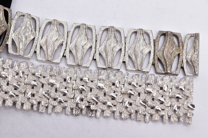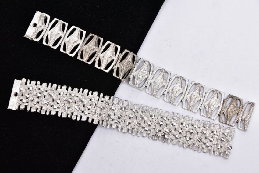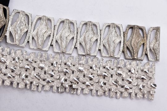 TWO SILVER WIDE BRACELETS, the first of an openwork abstract design, fitted with a double locking clasp, hallmarked 'D Shackman & Sons' London 1975, length 190mm, width 23.1mm, together with another textured, abstract design, fitted with a double locking clasp, hallmarked 'D Shackman & Sons' London 1975, length 175mm, width 25.5mm, approximate gross weight 138.3 grams (Condition report:- Overall condition good, general light wear, clasps in working condition)