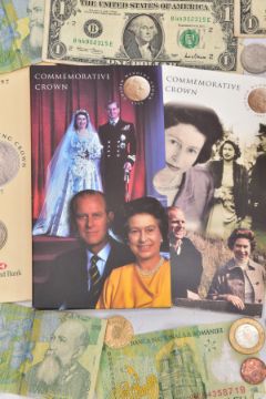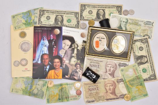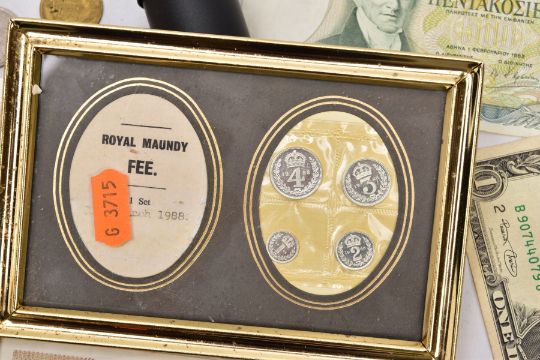 A SMALL BOX CONTAINING A 1988 FRAMED MAUNDY MONEY4 PIECES IN ORIGINAL PACKET, a Midland Bank 1997 Golden Wedding Crown in Royal Mint packaging, other loose modern Hong Kong coins, etc