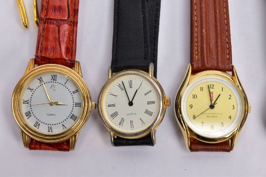 FIVE WRISTWATCHES AND A POCKET WATCH, to include a ladies 'Citizen Eco-drive' with a mother of pearl dial, Roman numerals and baton markers, fitted with a stainless steel bracelet and fold over clasp signed 'Citizen', together with four others and a yellow tone full hunter pocket watch, dial signed 'Von Hattenberg', Roman numerals, black hands, within a decorative case fitted with a yellow tone Albert chain