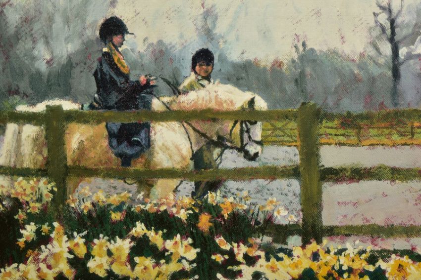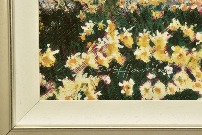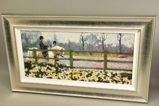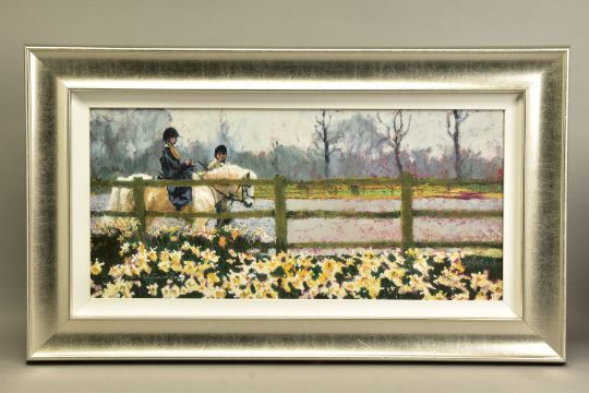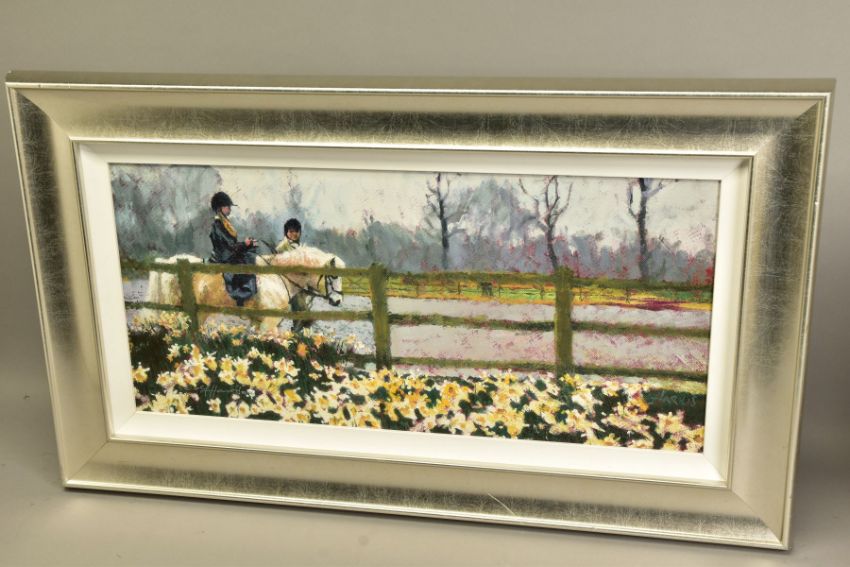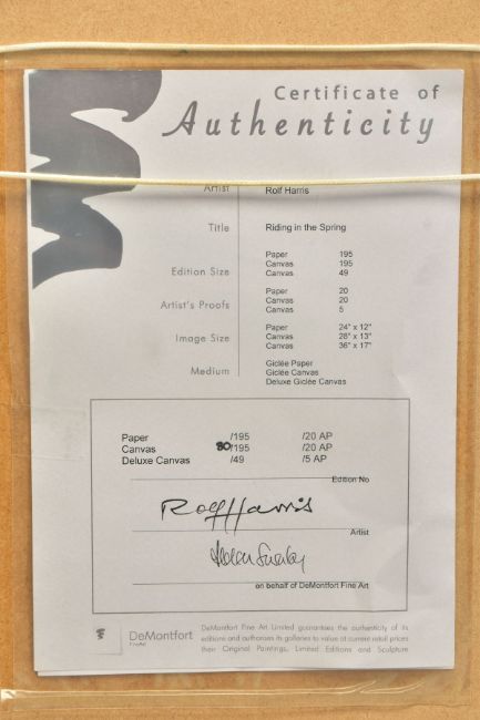 ROLF HARRIS (AUSTRALIAN 1930), 'RIDING IN THE SPRING', a limited edition print of a child riding a pony 80/195, signed bottom left, with certificate, approximate sizes - image 33cm x 71cm, frame 55cm x 93cm (Condition Report:- frame chipped and scratched) (ARR)