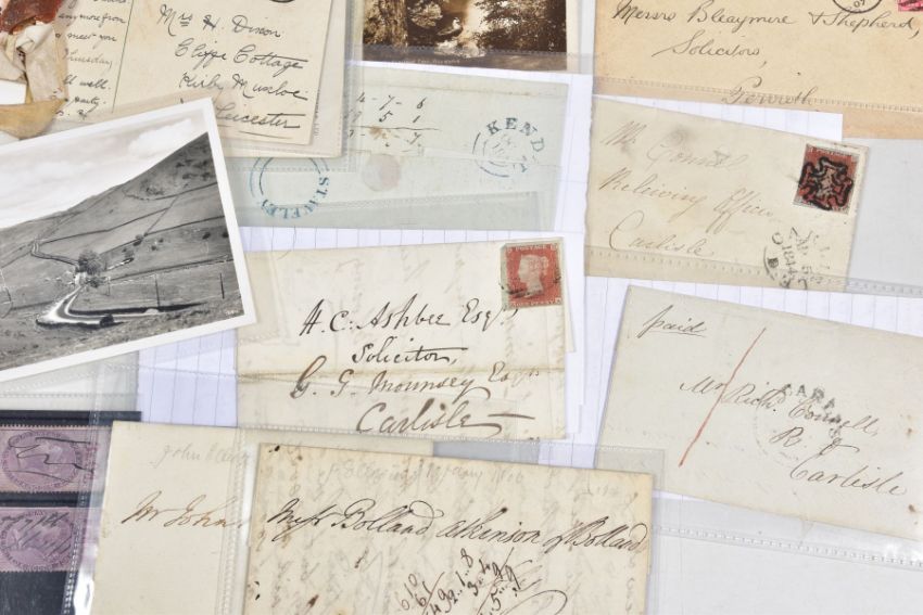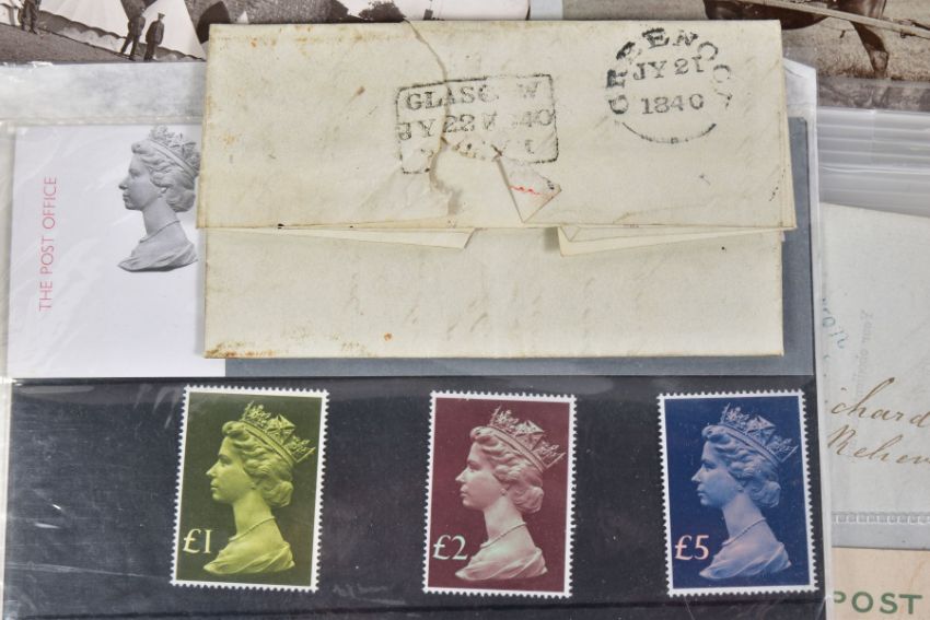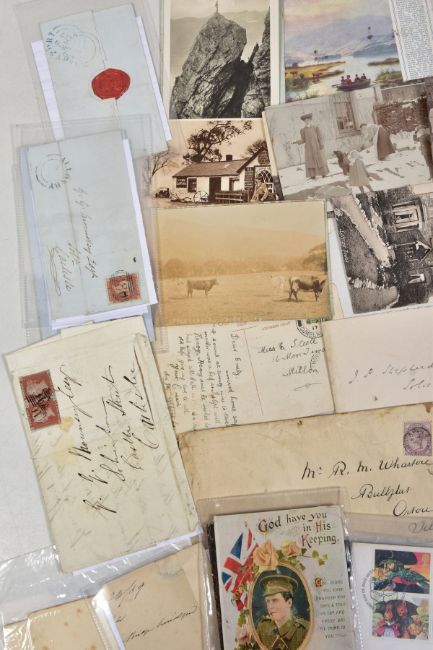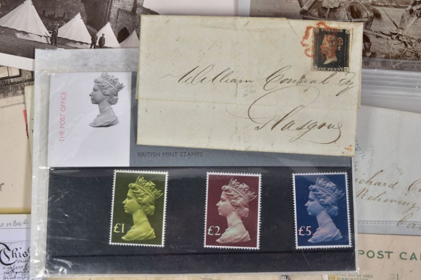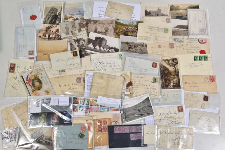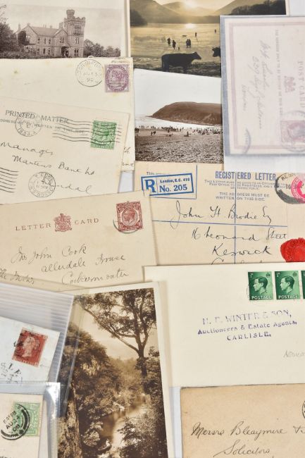 INTERESTING BUNDLE OF POSTAL HISTORY AND POSTCARDS relating to Lake District area, noting Penny Black on cover (adhesive damaged) some imperf penny red covers with penny post markings, some later material inc 1977 Machin high values presentation pack