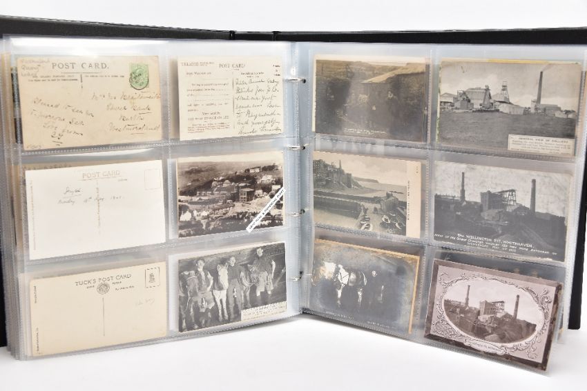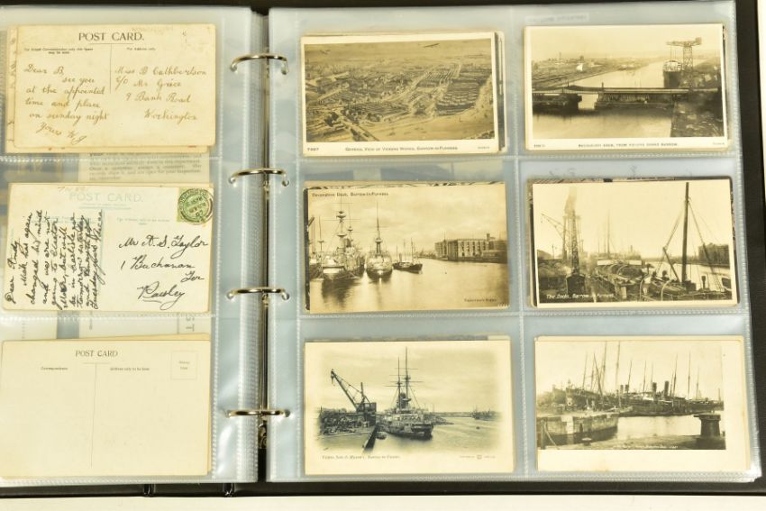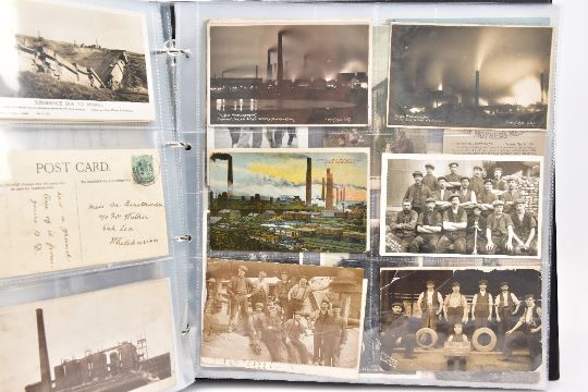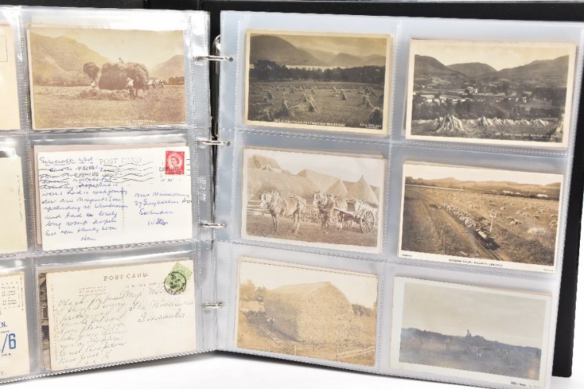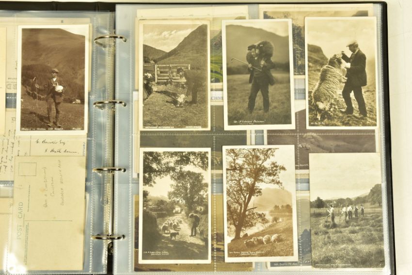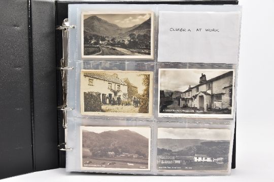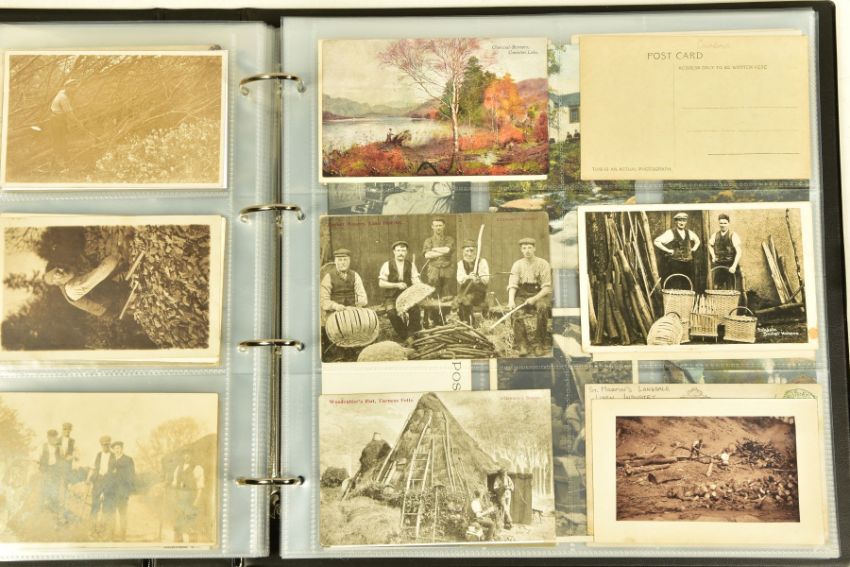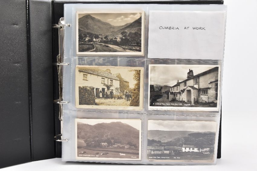 POSTCARDS: CUMBRIA AT WORK, a collection of approximately 385 Postcards and Photocards in one Album, thematically relating to working occupations in Cumbria the cards date from the Edwardian era / early 20th Century and feature some unusual and rare examples. Professions include Farming and Markets, Quarrying, Lead and Coalmining, Brass, Iron and Steel Works including the Vickers' Works, Spinning and Weaving Mills, Blacksmiths and Woodcutters, Fishing, Docks and Harbours including Ship launches, Sanatoriums, Schools and Colleges, Courts, Police and Army, including a rare card showing the Military funeral of Gunner Newell 33rd RFA, killed by lightning 11th June 1912, there are also several postcards of the Appleby New Fair and several Churches, publishers of the cards include Mayson's 'Autochrom', G.P. Abraham, Sankey's, F. Frith, Brittain and Wright, Morland Braithwaite and Pettit's Prize Medal Services, amongst others, most cards are in good, very good or excellent condition.