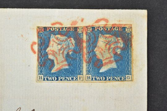 GB 1840 TWO PENNY BLUE fine used pair on front, very close at top otherwise good margins
