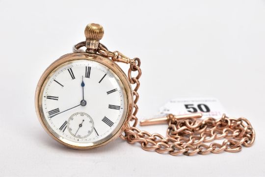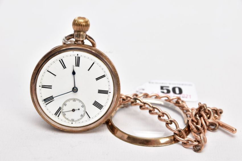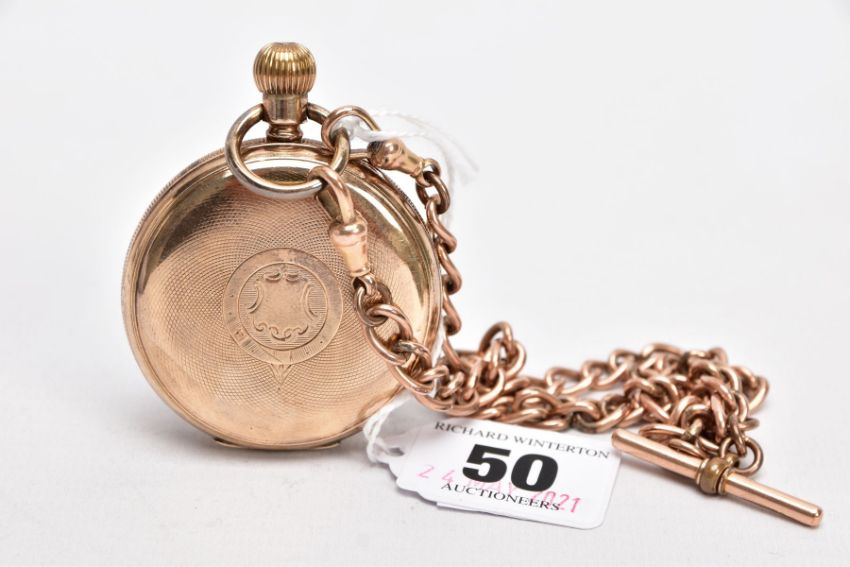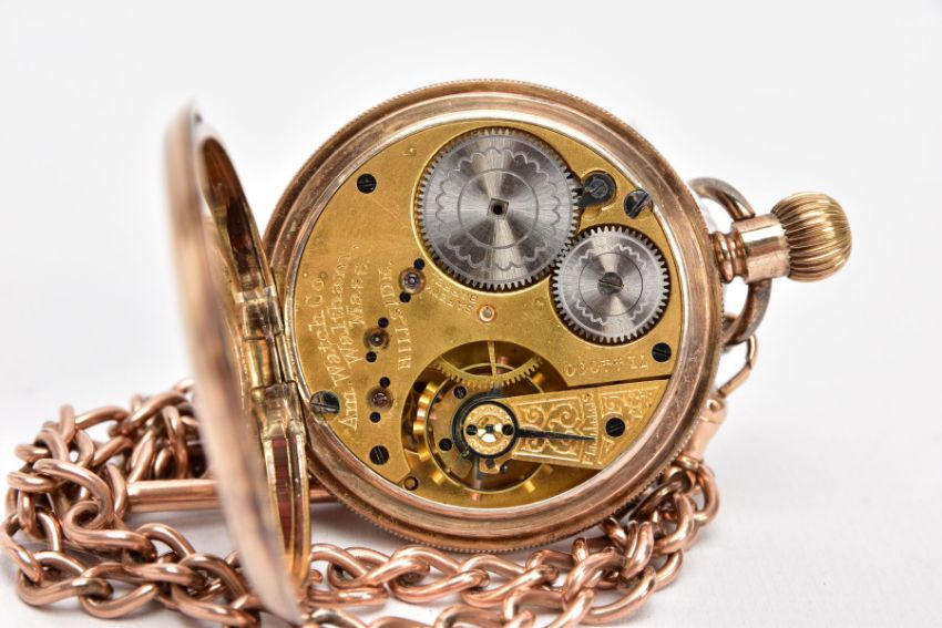 A GOLD PLATED OPEN FACE POCKET WATCH WITH A ROLLED GOLD ALBERT CHAIN, white dial, roman numerals, seconds subsidiary dial at the six o'clock position, blue hands, within a plain polished engine turn designed case with a vacant cartouche, case back stamped 'A.L.D.' 133, movement signed 'AM. Watch Co, Waltham Mass, Hillside, 7144090', approximate case width 49.1mm, suspending from a Albert chain fitted with two lobster hook clasps and a T-bar stamped 'rolled gold' (Condition Report:- overall condition good, general light wear, in working order)