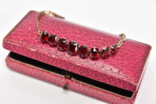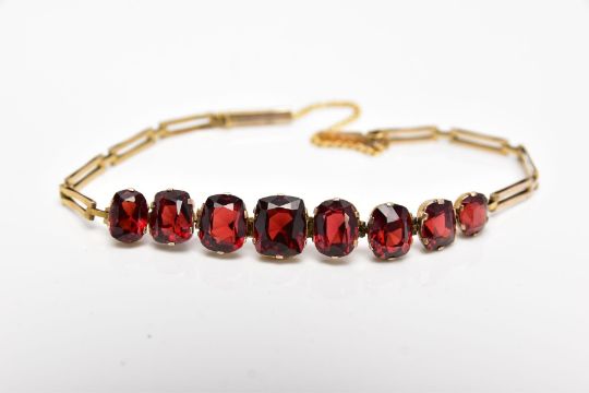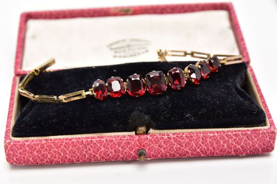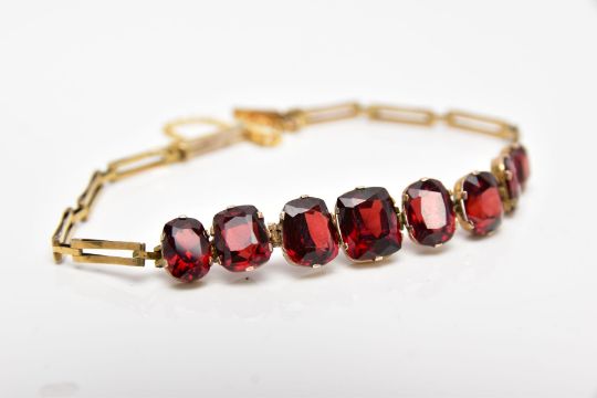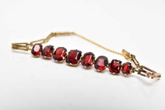 AN EDWARDIAN YELLOW METAL, GARNET SET BRACELET, designed with a row of graduated cushion and oval cut garnets, fitted with elongated openwork rectangular links, push pin clasp with an additional safety chain, approximate length 160mm, approximate gross weight 5.9 grams, together with box (condition report: overall condition good, general light wear, stones in good condition no chips or damage, clasp in working condition)