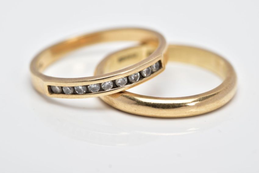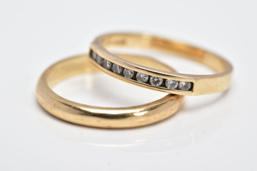 A 9CT GOLD HALF HOOP DIAMOND RING AND A 9CT GOLD BAND, the half hoop set with a row of round brilliant cut diamonds, total estimated diamond weight 0.18cts, ring size O ½, hallmarked 9ct gold London import, together with a plain polished band, ring size N ½, hallmarked 9ct Birmingham, approximate gross weight 4.7 grams