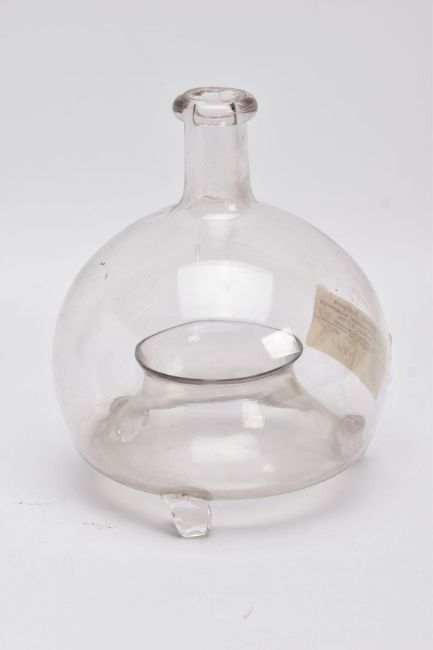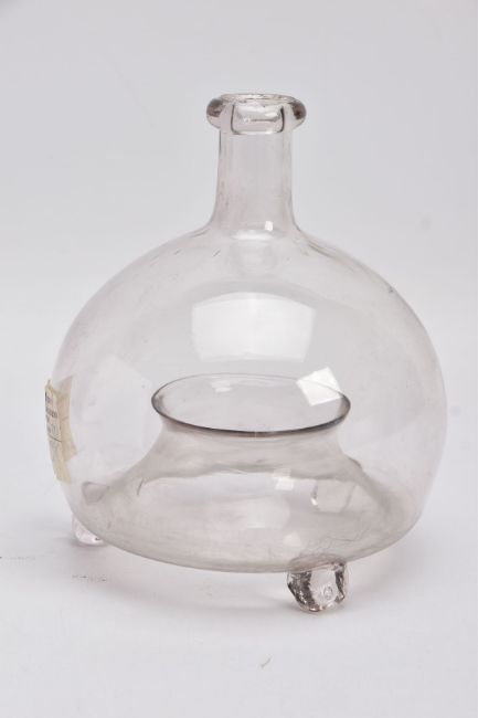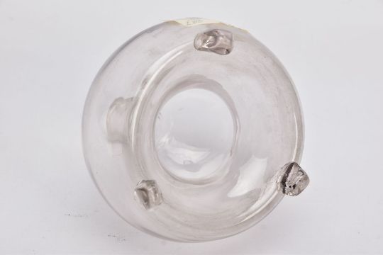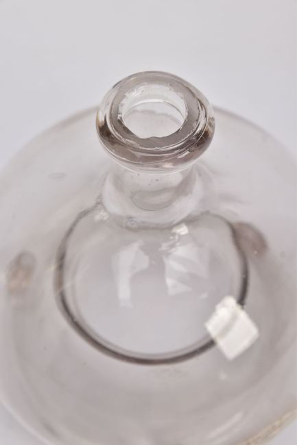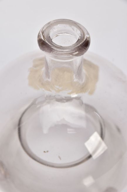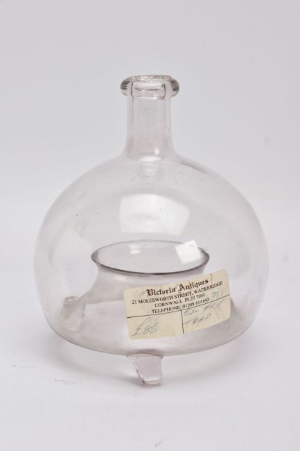 A LATE 18TH/19TH CENTURY HAND BLOWN GLASS FLY CATCHER BOTTLE, of onion form, height 17cm, the uppermost rim has nibbles and is rough to touch and lacks stopper