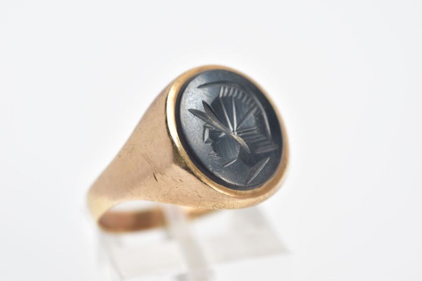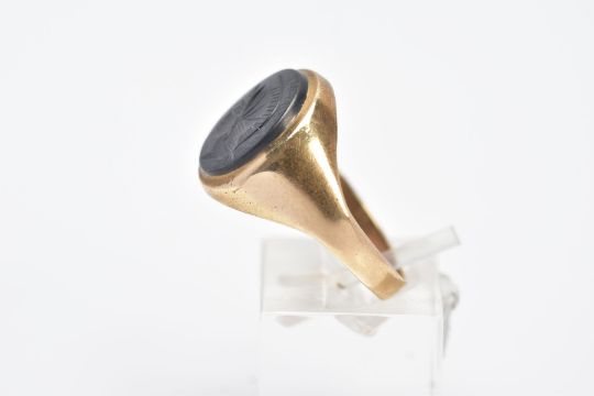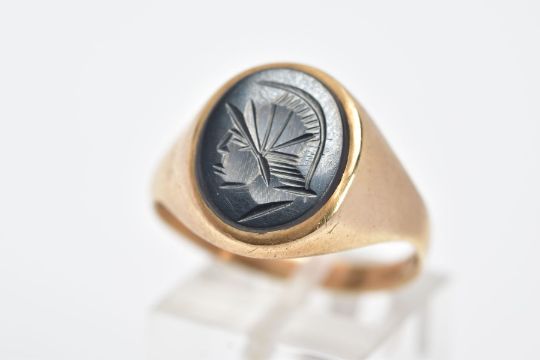 A 9CT GOLD GENTS HEMATITE INTAGLIO SIGNET RING, of an oval form depicting a Roman soldier, plain polished shoulders, ring size sitting at S but shank is misshapen, hallmarked 9ct gold London, approximate gross weight 4.7 grams