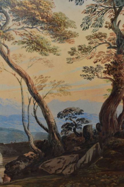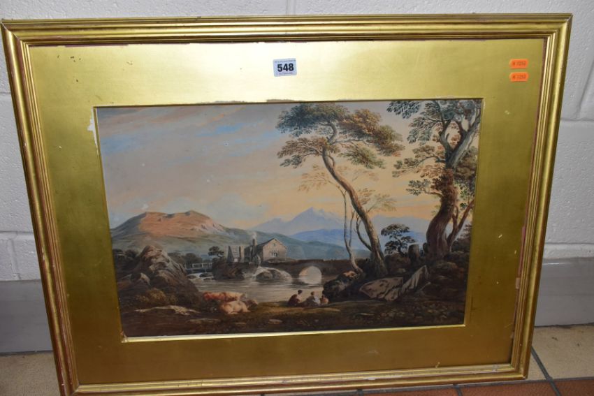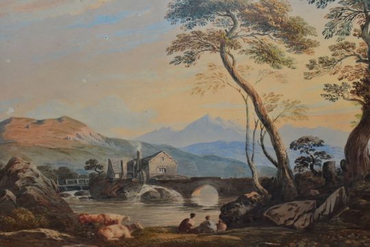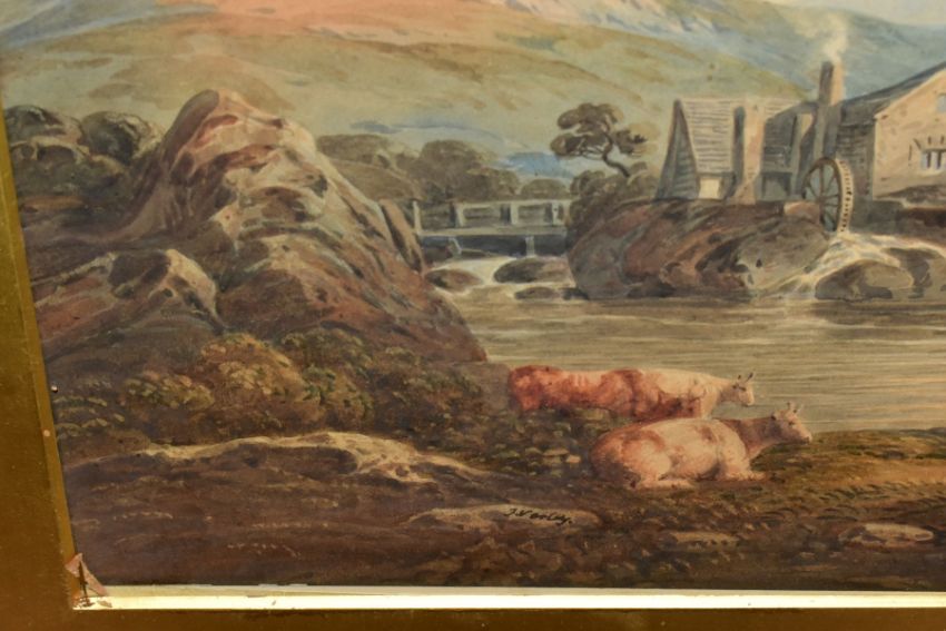 JOHN VARLEY (1778-1842) FIGURES AND CATTLE RESTING BESIDE A RIVER, watermill to the mid ground, hills to the distance, signed lower left, watercolour on paper, framed, approximate size 35cm x 53cm (Condition:- staining visible to lighter areas, mount and frame have some damage)