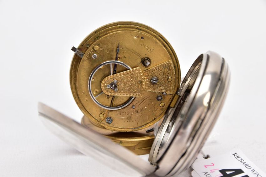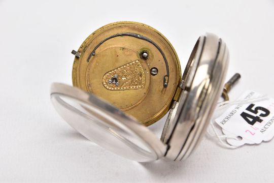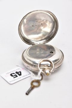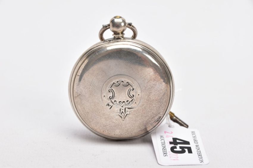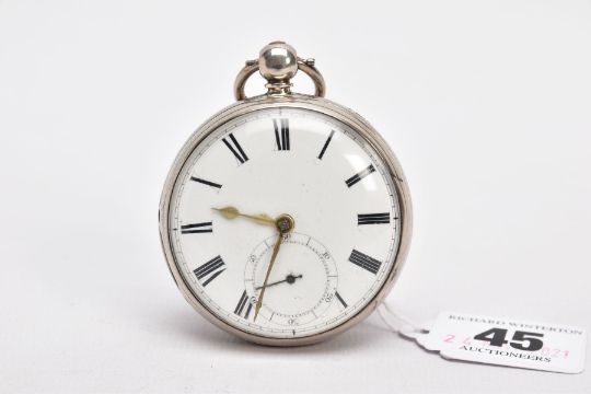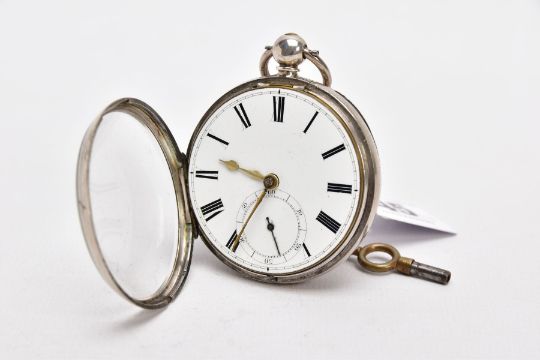 A GEORGE III, SILVER OPEN FACED POCKET WATCH, white dial, Roman numerals, seconds subsidiary dial at the six o'clock position, gold tone hands, worn engine turn design with a vacant cartouche, case back hallmarked London 1793, approximate case width 51.1mm, together with watch key (condition report: general light wear, worn design, working condition)