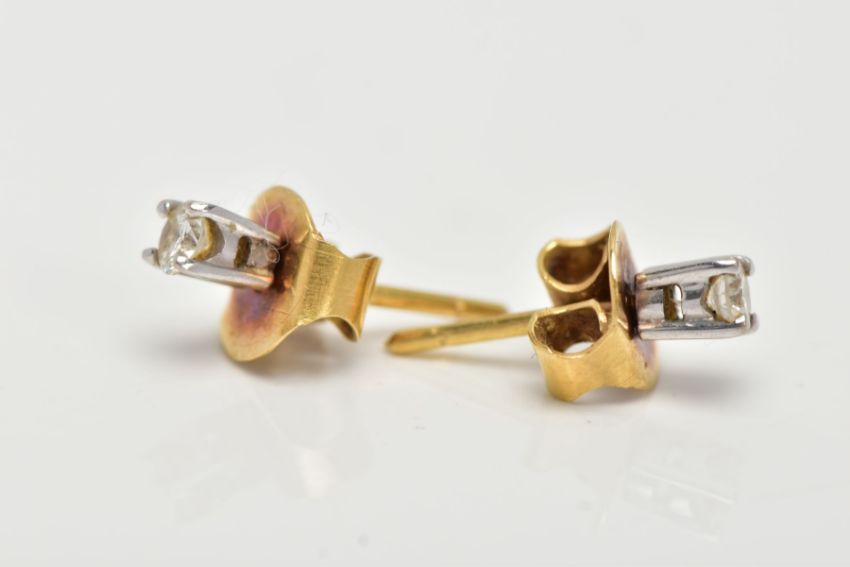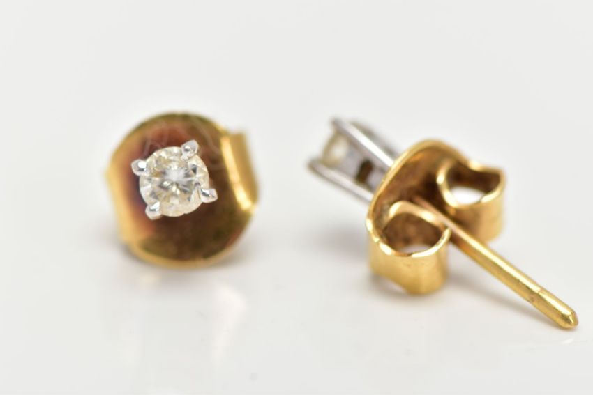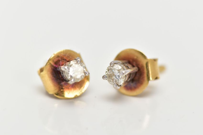 A PAIR OF YELLOW METAL DIAMOND STUD EARRINGS, each designed with a claw set round brilliant cut diamond, total estimated diamond weight 0.30cts, colour assessed as L/M, clarity assessed as I1, post and scroll fittings, approximate gross weight 1.8 grams (condition report: overall condition good, general light wear)