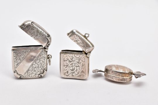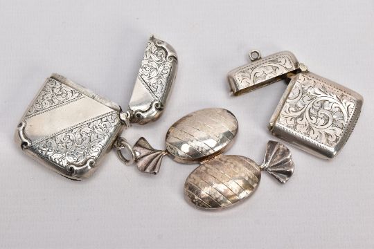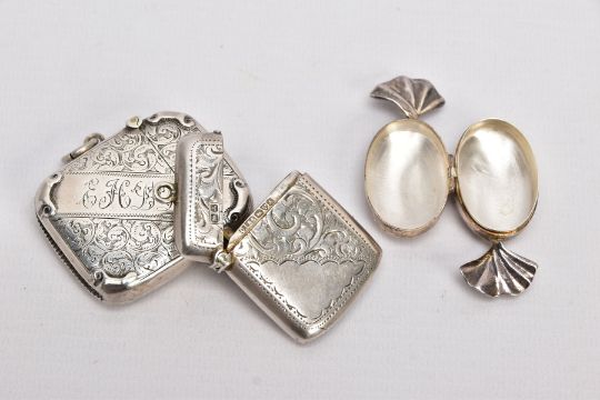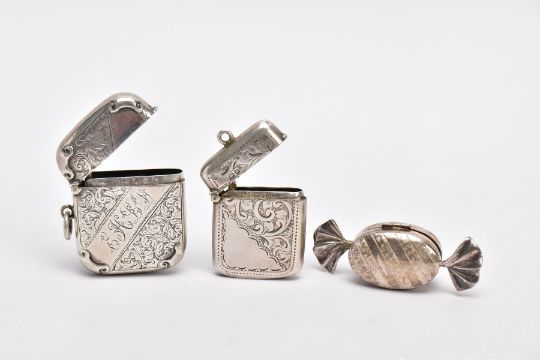 TWO SILVER VESTAS AND A PILL BOX, the first vesta of a rounded square form, decorative floral and scroll design, engraved monogram, striker to the base, hallmarked 'Synyer & Beddoes' Birmingham 1898, fitted with a jump ring, the second of a rectangular form, decorative foliate design, vacant cartouche, striker to the base, hallmarked possibly 'Charles Westwood & Sons' Chester 1901, together with a pill box in the form of a sweet wrapper, textured detailing, hallmarked 'Ari D Norman' London 1997, approximate gross weight 66.3 grams, 2.13 ozt