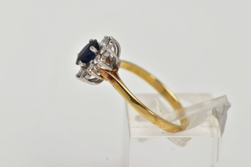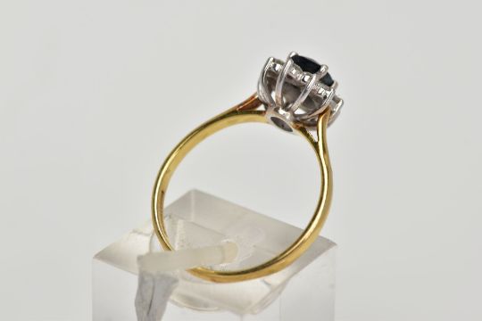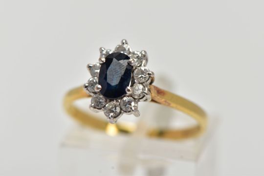 AN 18CT GOLD SAPPHIRE AND DIAMOND CLUSTER RING, centring on an oval cut blue sapphire (possibly glass filled), within a surround of claw set, round brilliant cut diamonds, total estimated diamond weight 0.30cts, tapered shoulders, hallmarked 18ct gold Birmingham, ring size N, approximate gross weight 2.9 grams (condition report: overall condition good, general light wear)