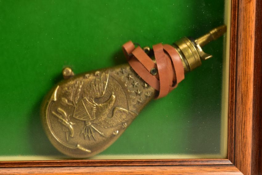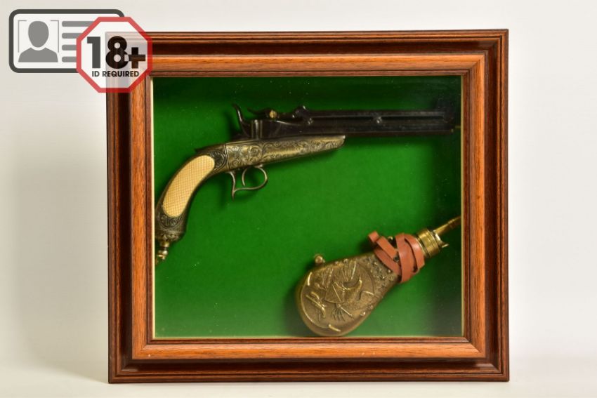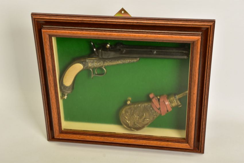 A NEATLY FRAMED DISPLAY CASE containing a cast metal replica of a Collette Gravity pistol, together with a replica brass American design powder flask