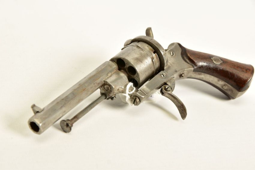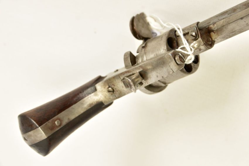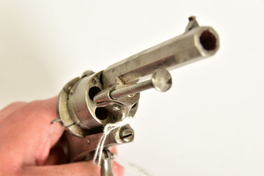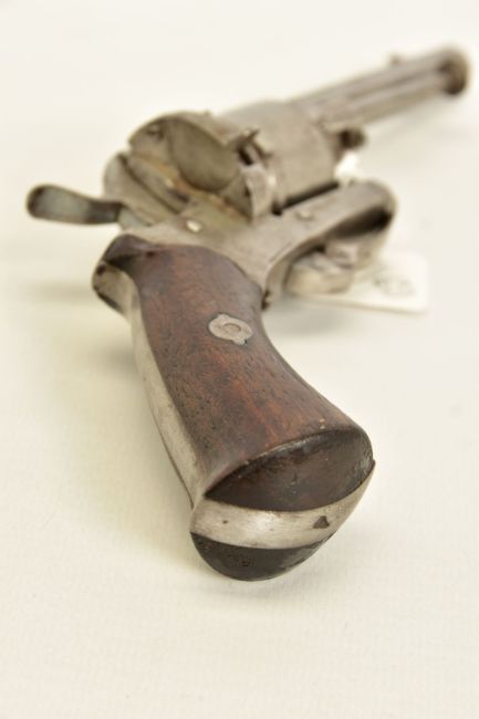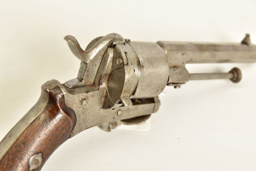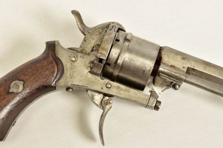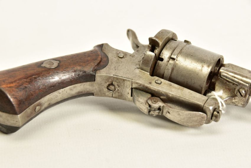 A 7MM PIN-FIRE POCKET REVOLVER fitted with a folding trigger, it is fitted with a two piece set of walnut grips and has a hinged loading gate at the rear of the six chambered cylinder, it is in correct working order and it's overall condition is excellent, it was made in Belgium and bears Liege proof marks, (THIS IS CLASSED AS ANTIQUE UNDER SECTION 58 (2) OF THE FIREARMS ACT 1968)