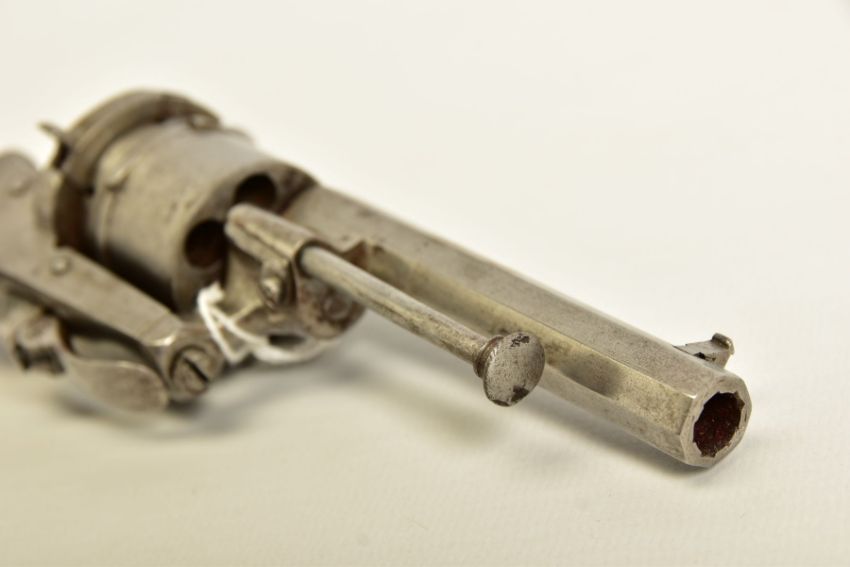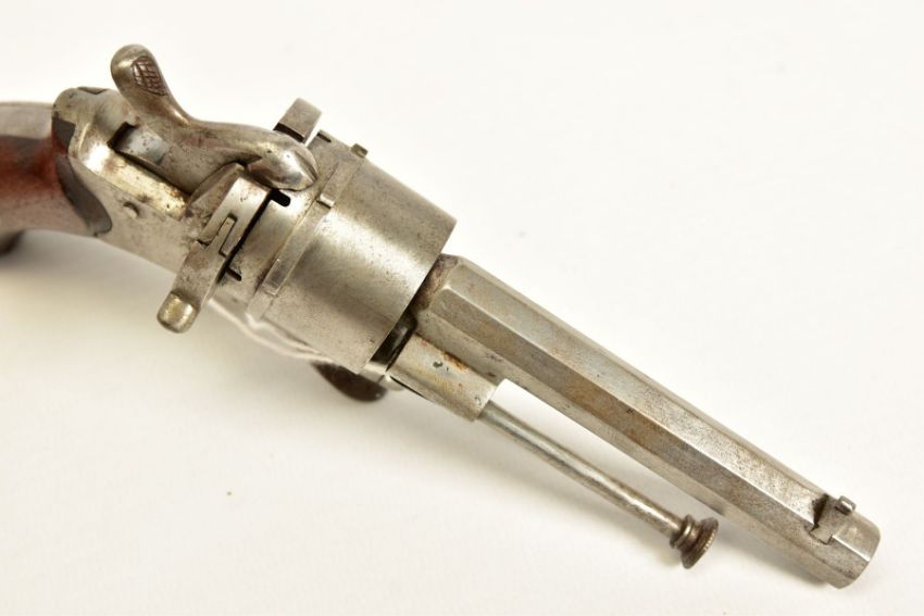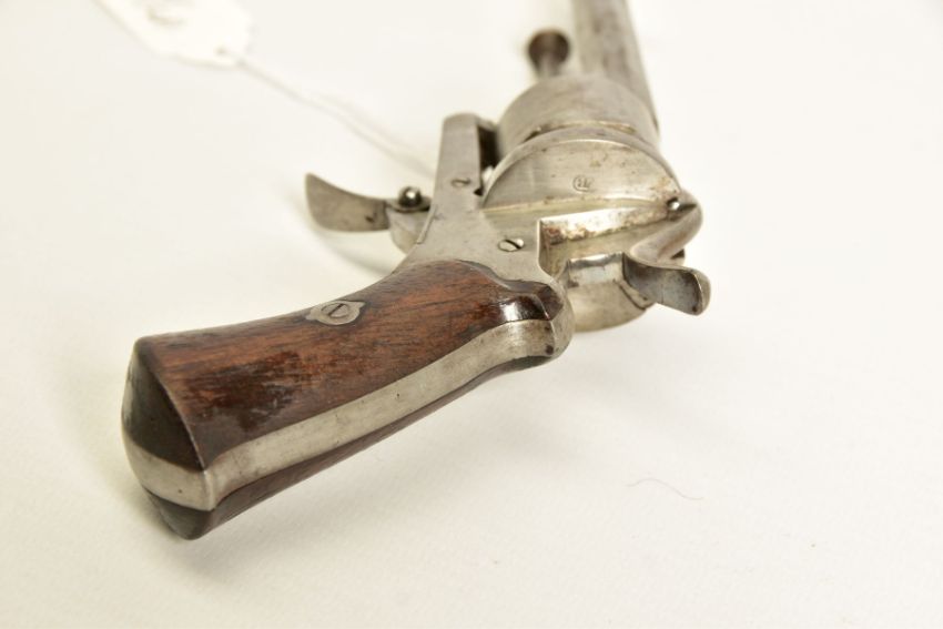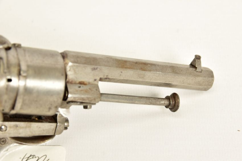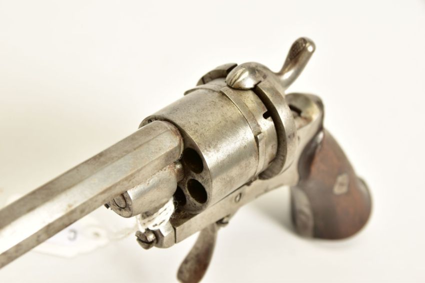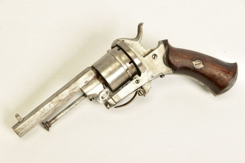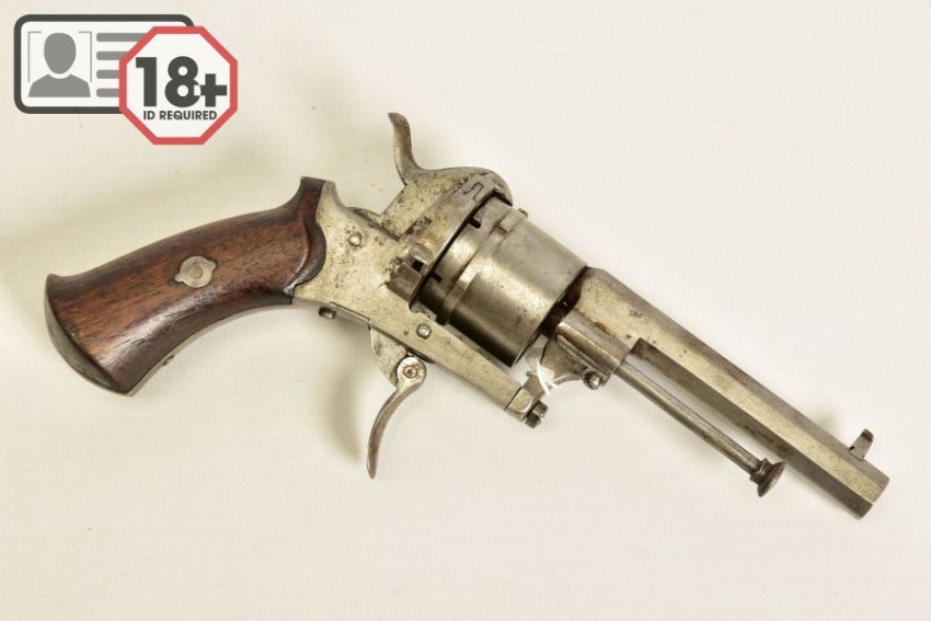 A 7MM PIN-FIRE POCKET REVOLVER fitted with a folding trigger, it is fitted with a two piece set of walnut grips and has a hinged loading gate at the rear of the six chambered cylinder, it is in correct working order and it's overall condition is excellent, it was made in Belgium and bears Liege proof marks, (THIS IS CLASSED AS ANTIQUE UNDER SECTION 58 (2) OF THE FIREARMS ACT 1968)