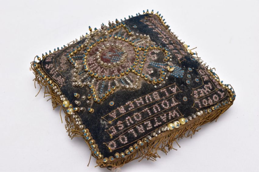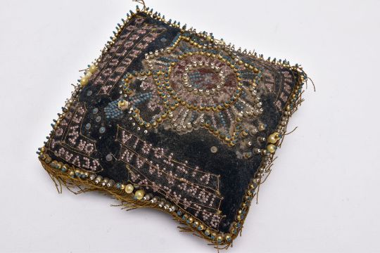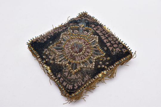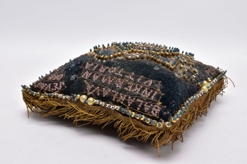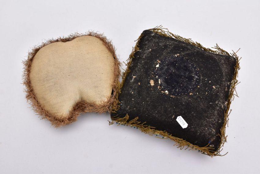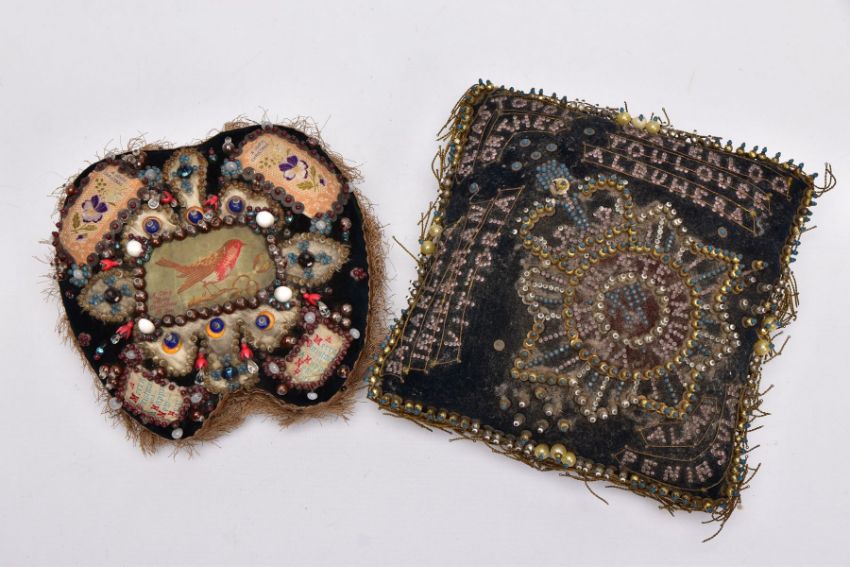 TWO STUFFED SMALL PILLOWS OF PRE WWI ERA, the type made to send to wives, sweethearts etc, usually with a Military theme, (a) is square with many references to the Crimean War of 1854, mainly black with lots of work, beading etc, (b) is a Christmas themed cushion, kidney shaped with small silk panels featuring Christmas messages, Robin, etc
