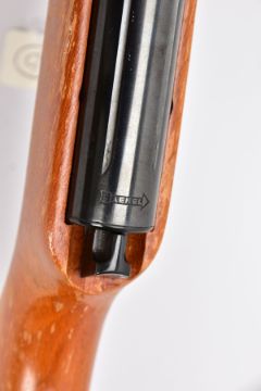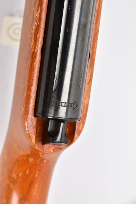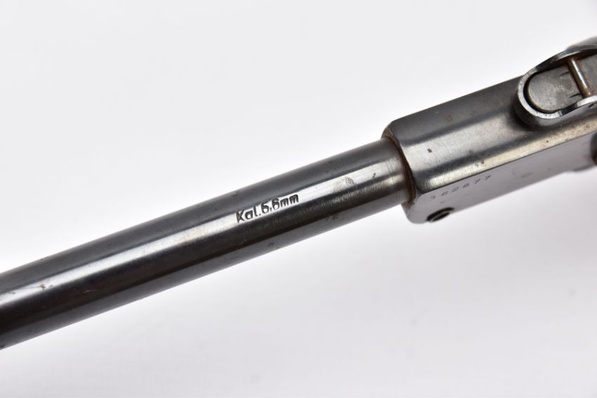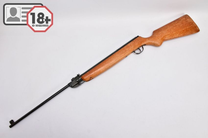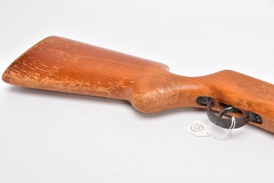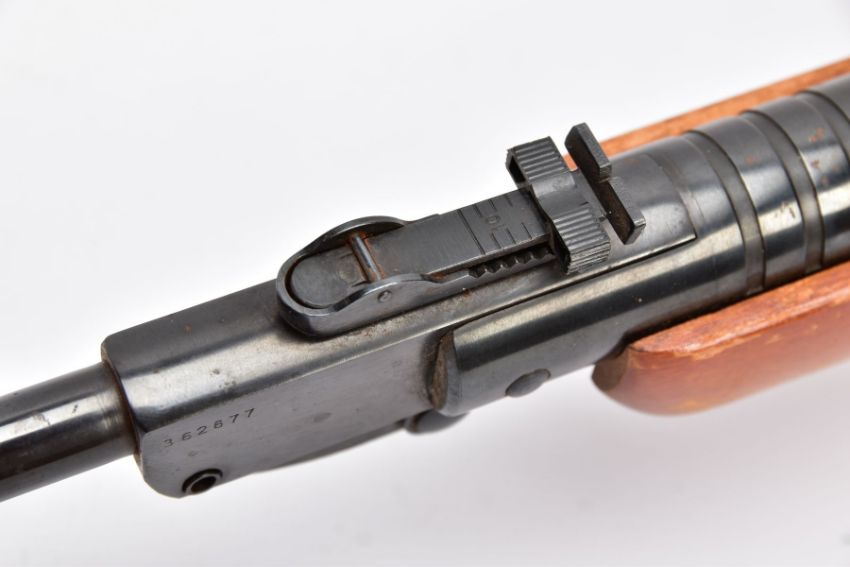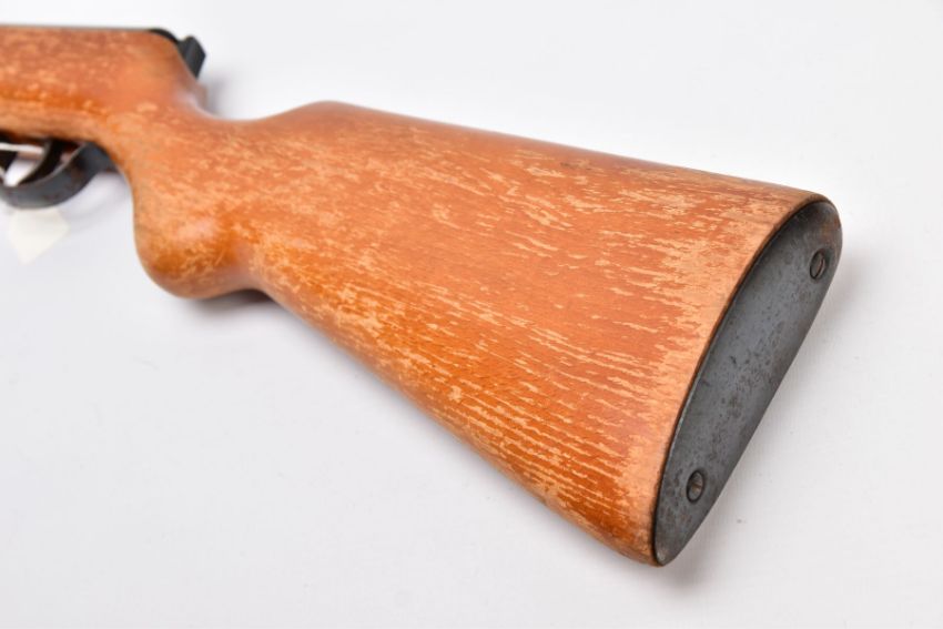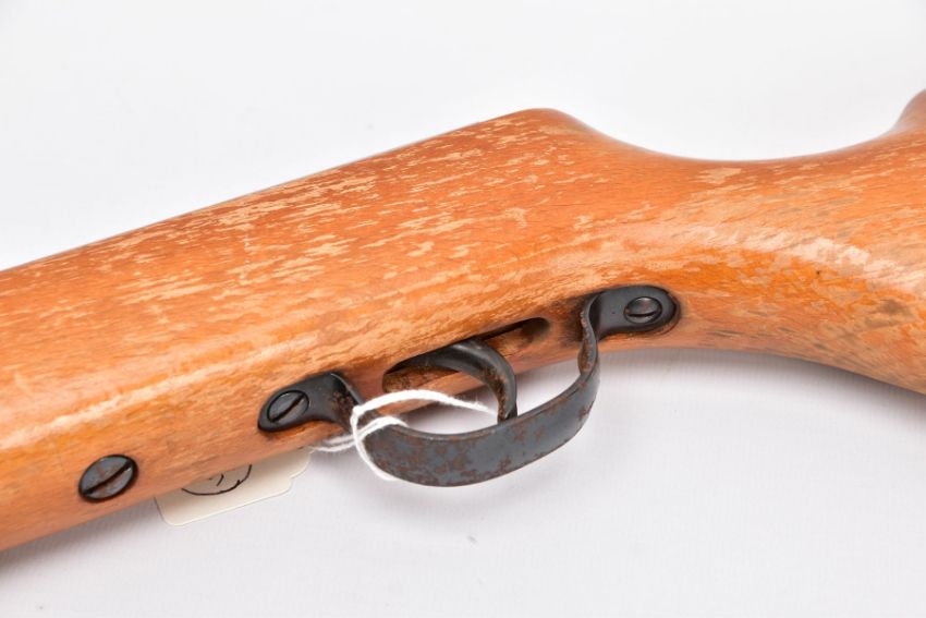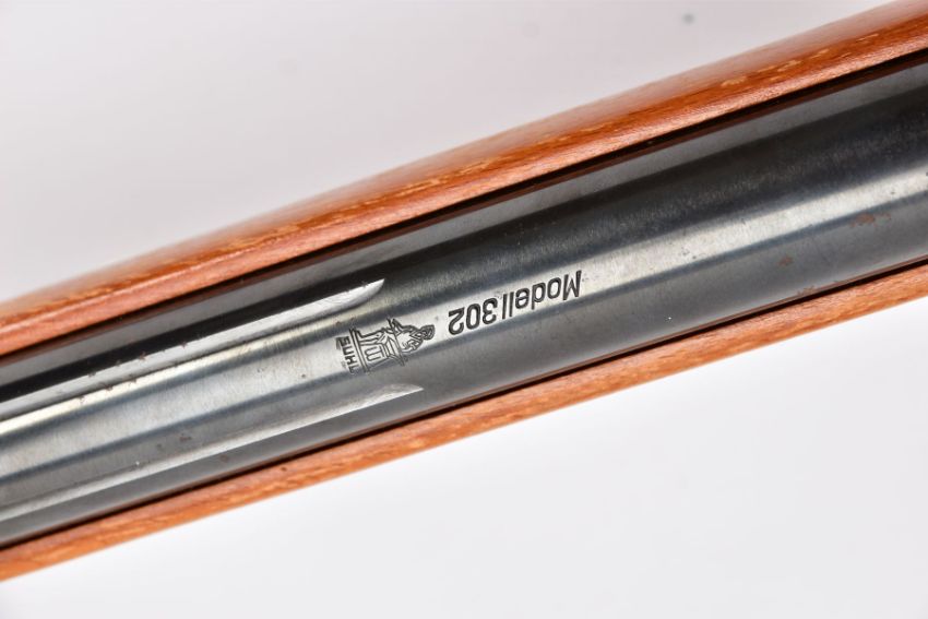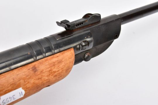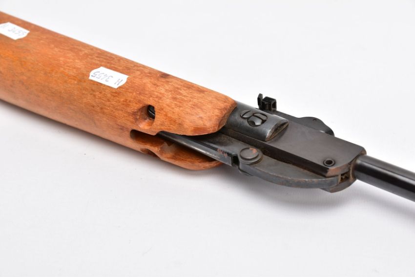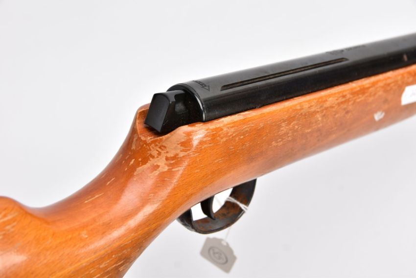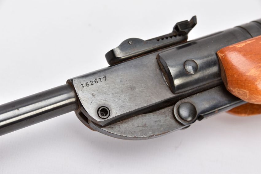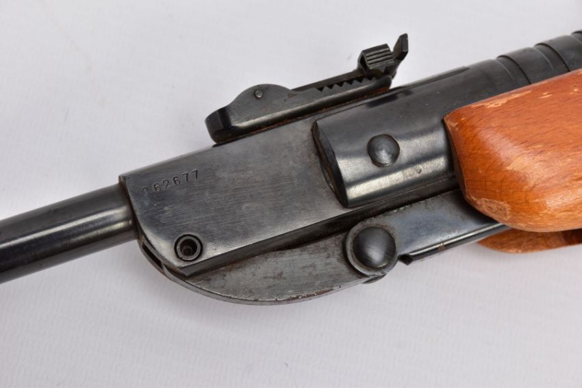 A GERMAN .22'' HAENEL MODEL 302 AIR RIFLE serial number 362677 first seen advertised in 1969 and replaced by the model 303 between 1970 and 1978, the varnished stock has lost a considerable amount of it's varnished finish, most of it's blued finish remains but there are some patches of rust on the barrel, it is fitted with a ramp adjustable rear sight and post hooded foresight, it is in working order (PURCHASER MUST BE 18 YEARS OR OVER)