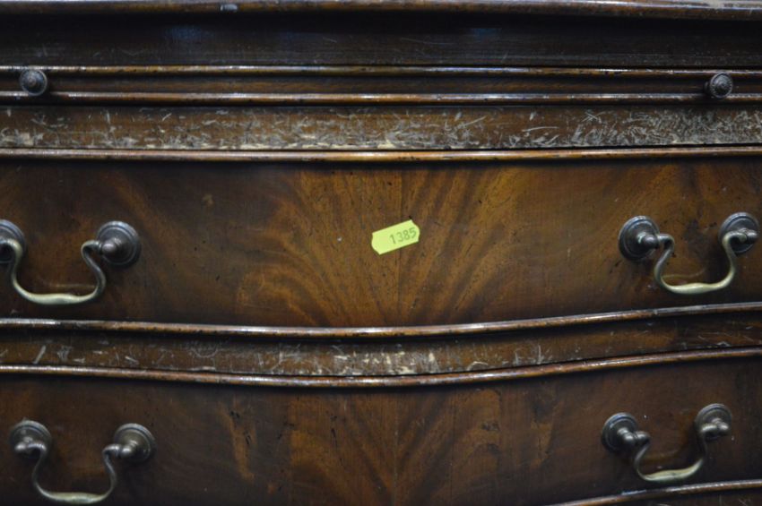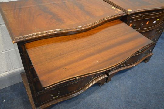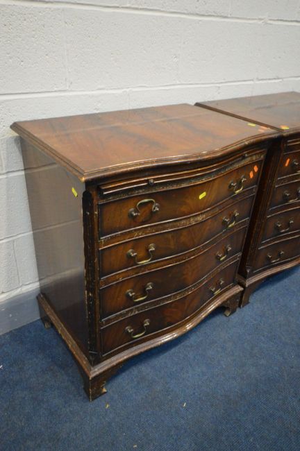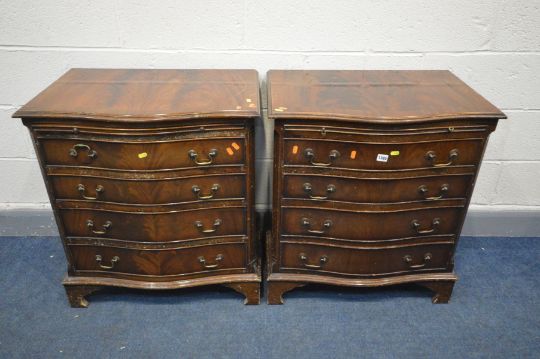 A PAIR OF REPRODUCTION MAHOGANY SERPENTINE CHEST OF FOUR LONG GRADUATED DRAWERS, with a brushing slide, on bracket feet, width 70cm x depth 46cm x height 78cm (Sd to finish, see image)