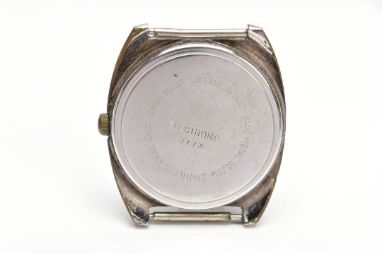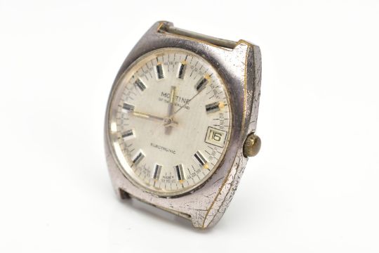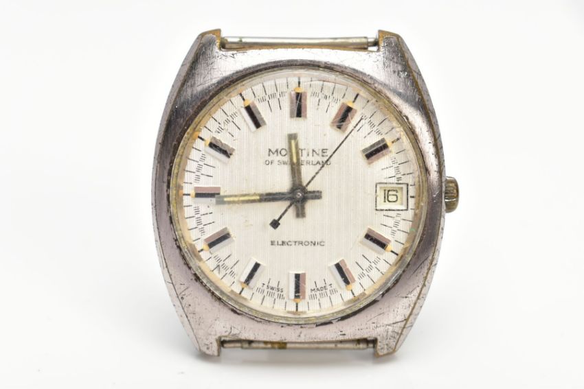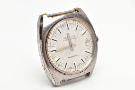 A MONTINE ELECTRONIC WRISTWATCH, featuring a silvered dial with a lineal design, baton markers and date window at three o'clock, curved case, approximate case width 36mm, numbered to the back 2773