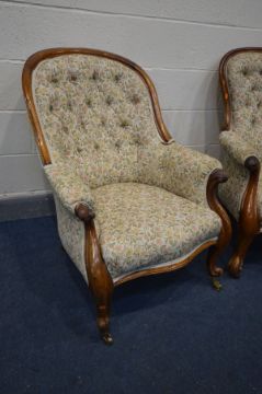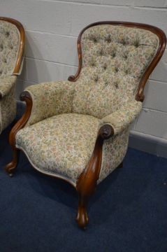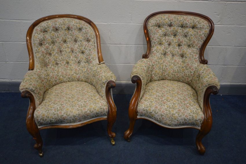 TWO VICTORIAN MAHOGANY ARMCHAIRS, floral upholstery, with scrolled and cabriole armrests (2)