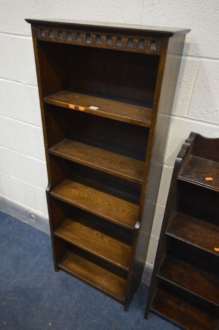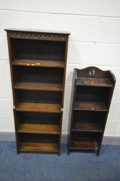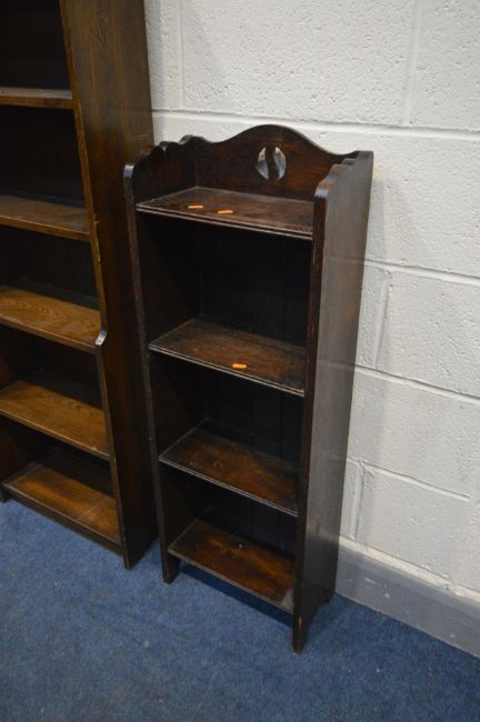 AN TALL SLIM EARLY TO MID 20TH CENTURY OAK OPEN BOOKCASE, width 39cm x depth 19cm x height 106cm along with another oak open bookcase (2)