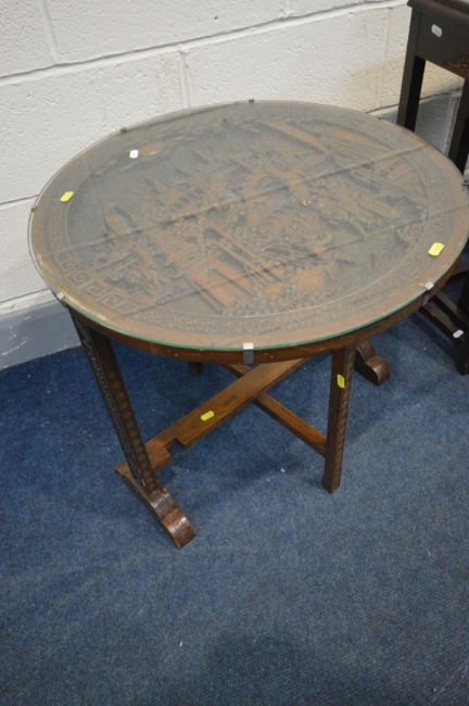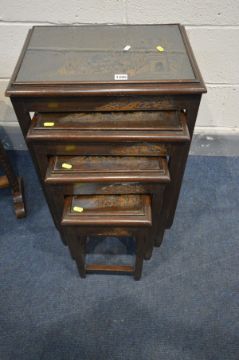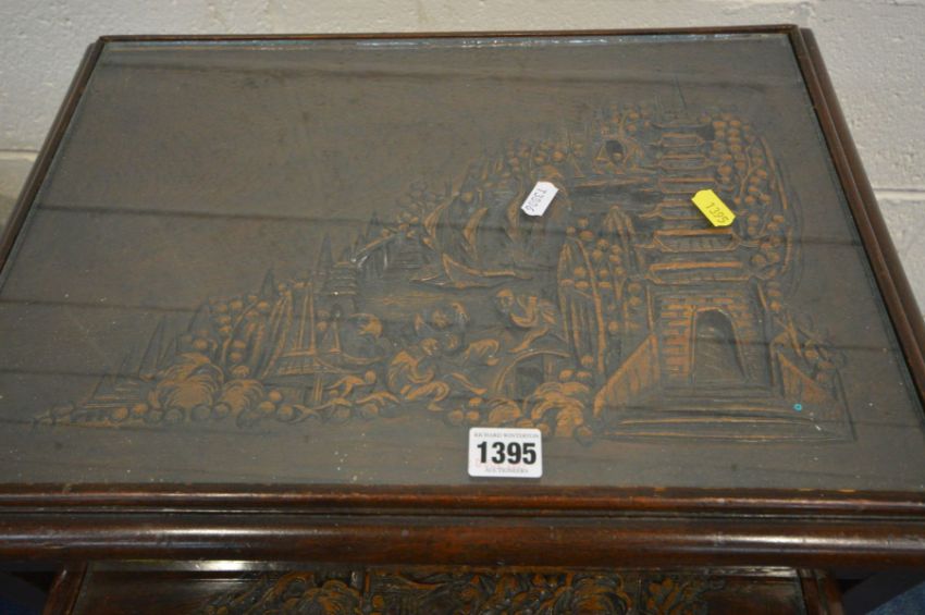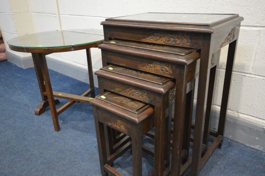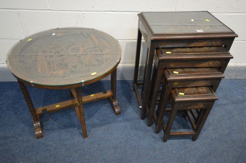 AN ORIENTAL HARDWOOD QUARTETTO NEST OF TABLES, with a carved landscape scene to each table below a glass top together with a similar style hardwood circular tilt top folding occasional table (2)