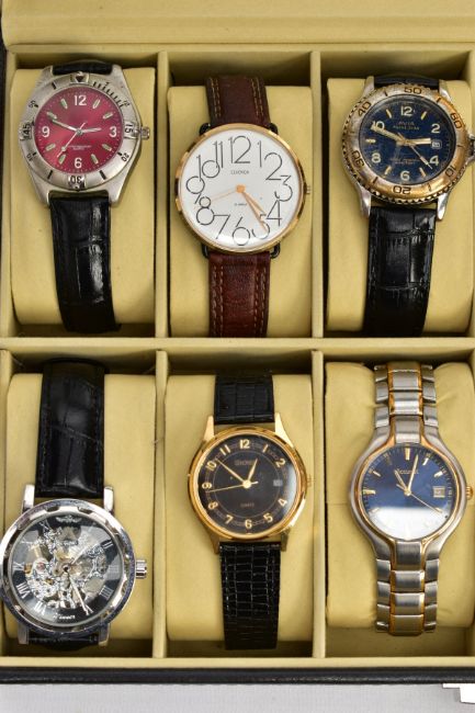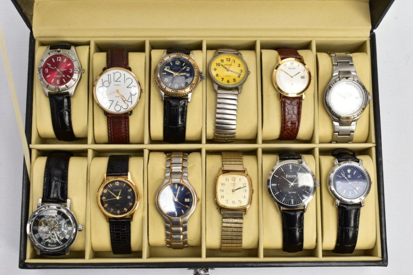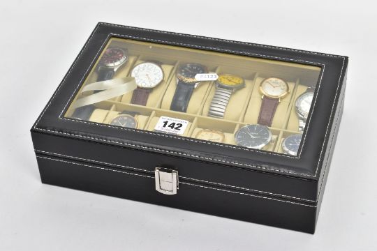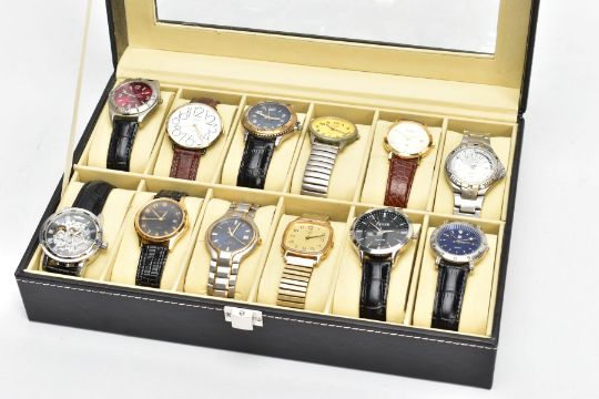 A CASE OF TWELVE GENTLEMAN'S WRISTWATCHES, to include Sekonda, Accurist, Timex, Umbro etc., all cased within a hinged black leather watch display case with clear perspex panel to lid