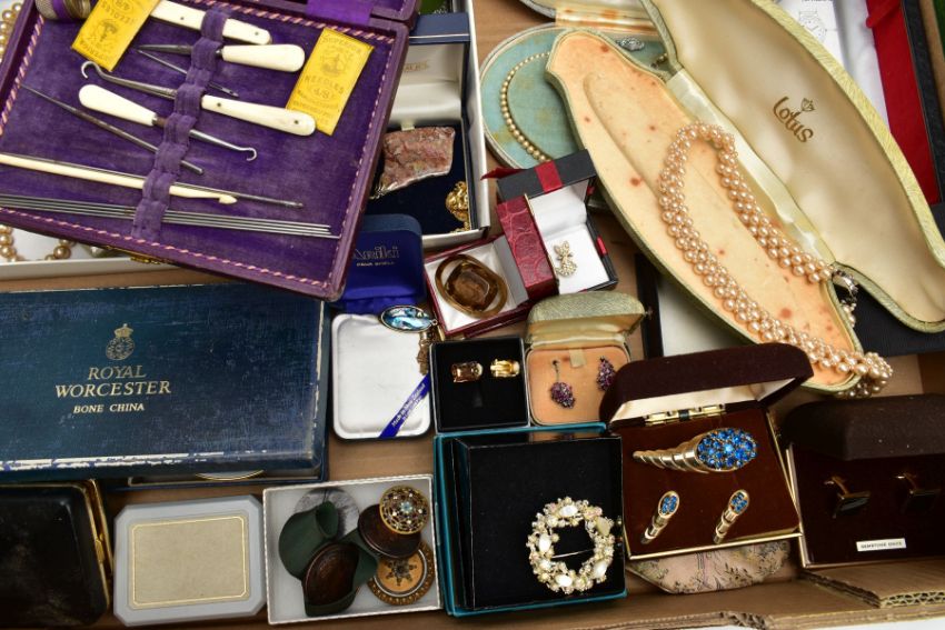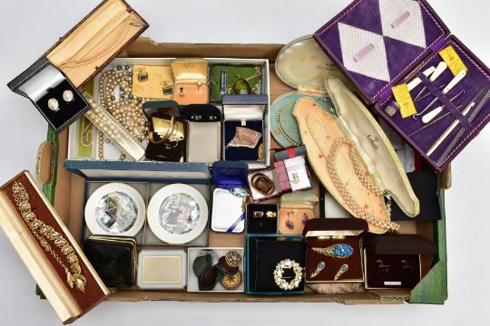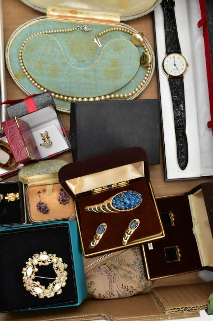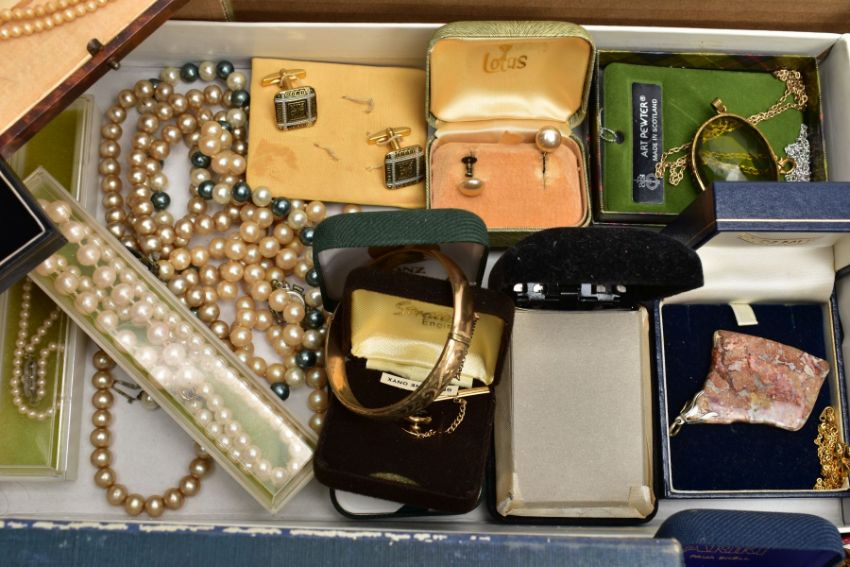 A BOX OF MAINLY COSTUME JEWELLERY, to include imitation pearl necklaces, two cut steel buttons, an openwork enamel button, a matching brooch and ear clip set, a cased sewing set, a 50 micron 9ct rolled gold hinged bangle, together with brooches, cufflinks, earrings, pendants etc