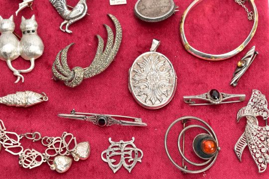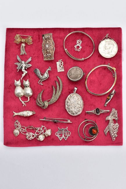 A SELECTION OF SILVER AND WHITE METAL JEWELLERY, to include two child's bangles, a Danish circular brooch with amber cabochon within concentric circles by N.E. From, an oval locket, a fairy brooch, three filigree brooches etc., most with hallmarks or marks to indicate silver, approximate total gross weight 112 grams