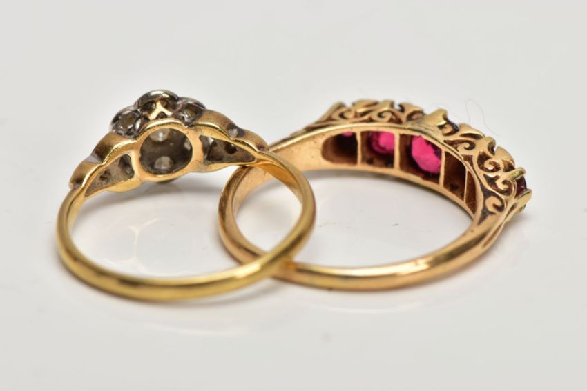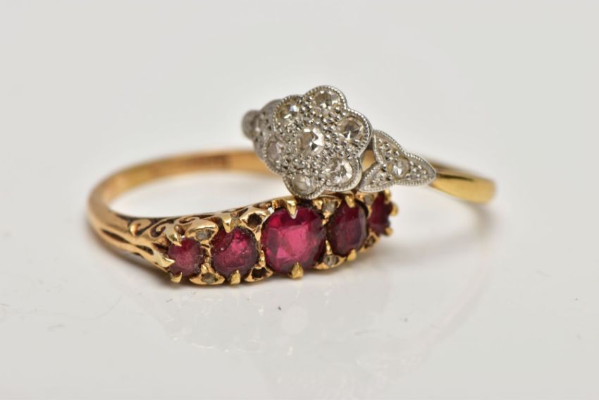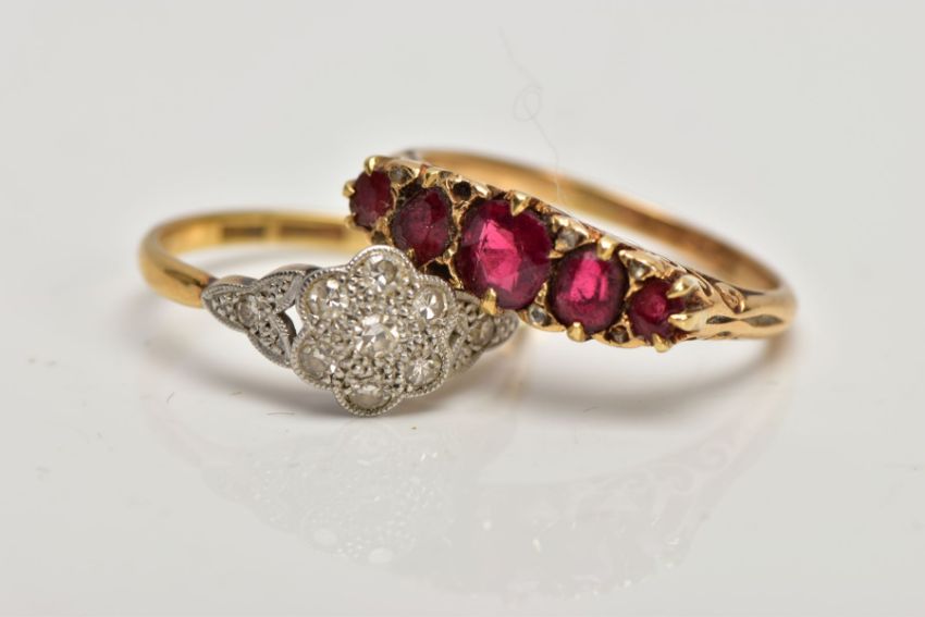 TWO EARLY 20TH CENTURY GEM SET RINGS. A daisy diamond cluster ring, estimated single cut diamond weight 0.50ct, ring size N1/2, stamped '18ct plat' and a 5 stone graduated half hoop ring, assessed as garnet topped doublets (some badly chipped) with diamond rose cut points between two of which are deficient, ring size, partial hallmark for 18ct gold visible. approximate gross weight 6.4 grams