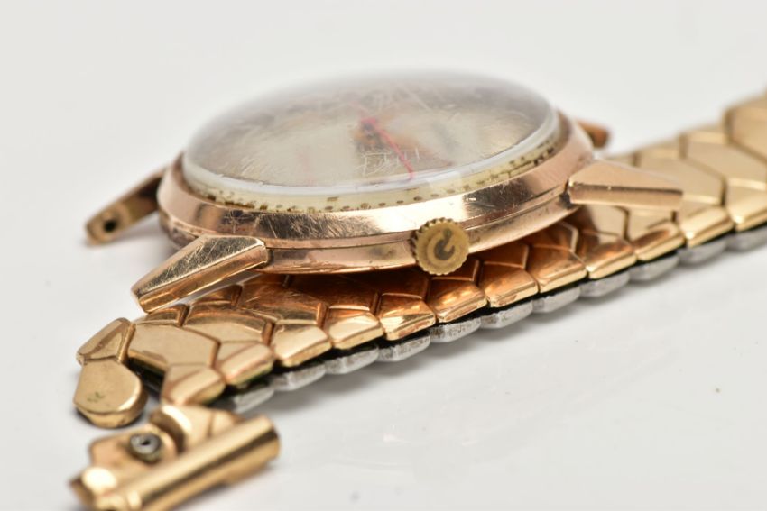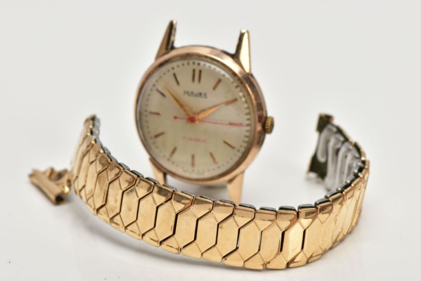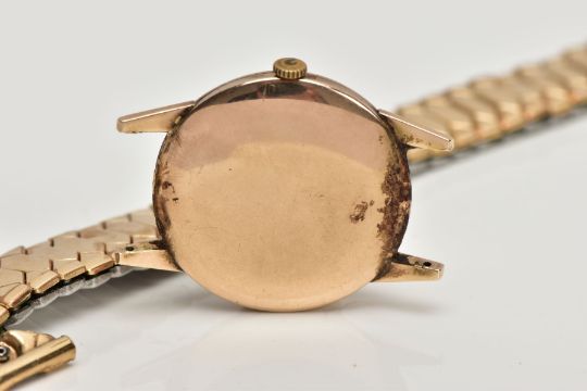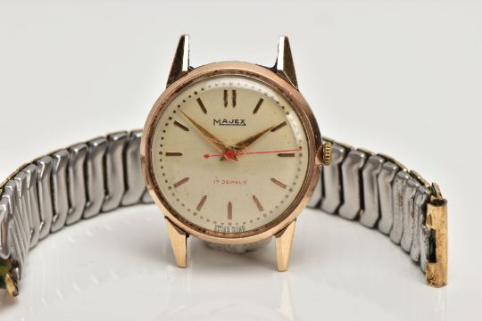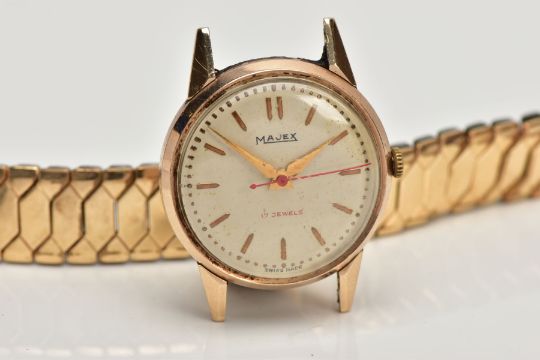 A 9CT GOLD CASED MAJEX HAND-WOUND WRISTWATCH, slightly deteriorating cream dial with gold baton markers and hands, case width approximately 32mm, case back stamped 375 Edinburgh, maker BWC, accompanied by a broken gold-plated expandable strap