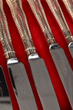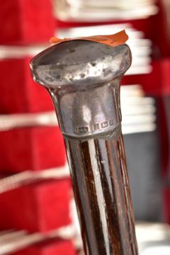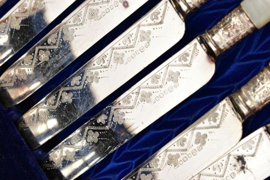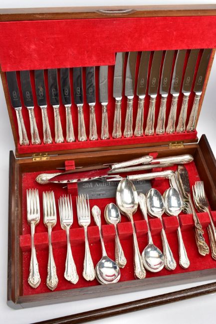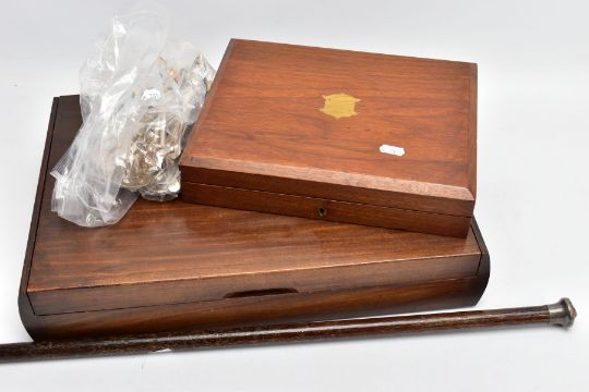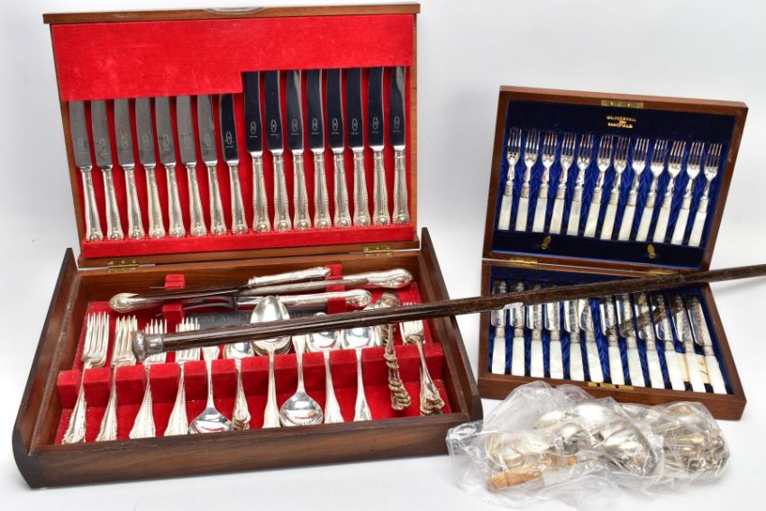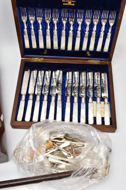 TWO SILVER PLATED CANTEENS OF CUTLERY AND A WALKING STICK, the first a hinged wooden box containing a set of twelve Walker & Hall silver plated knives and forks with mother of pearl handles and decorative floral detail to the metal, case with key, the second a larger hinged wooden box containing a canteen of silver plated cutlery, to include eight table knives and forks, eight side knives and forks, eight soup spoons, eight fish knives and forks, eight dessert spoons, six teaspoons, four serving spoons, a cake slice and carving set, together with a selection of various items of non matching silver plated cutlery, and a wooden walking stick with silver handle, hallmark for Dalman & Narborough Ltd, Birmingham 1978
